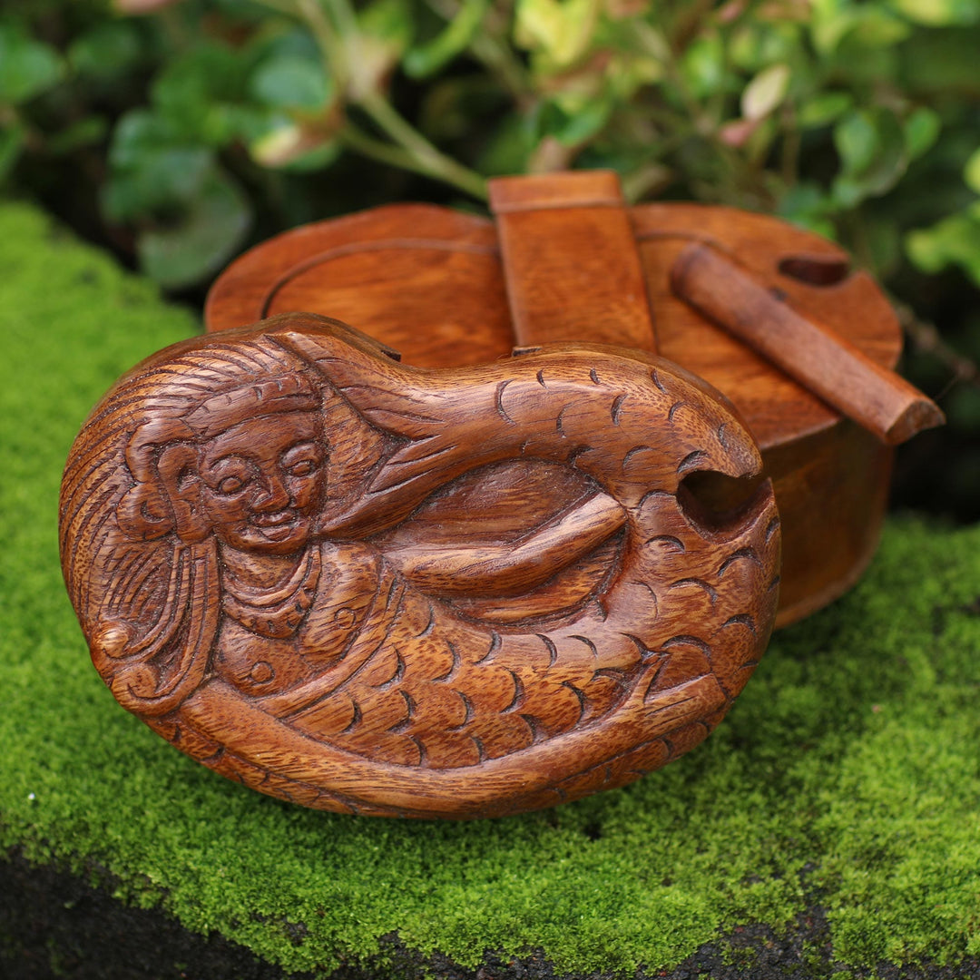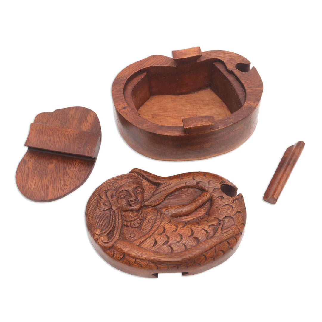 Hand Carved Suar Wood Mermaid Puzzle Box - Mermaid Dance