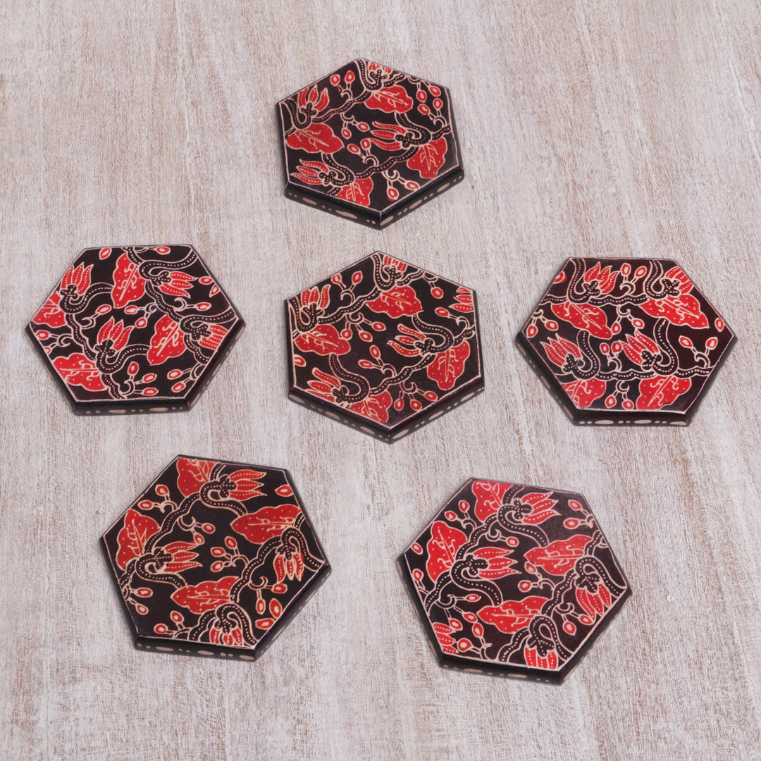 An exotic accessory to add to your home decor, this set of six hexagonal coasters is presented by Gunadi of Indonesia. Known as Kembang Kanthil in Javanese culture, a motif of magnolia flowers symbolizing love and compassion is stamped onto the coasters using the batik technique. Shades of black, red, and cream give the wadang wood coasters a dramatic touch.