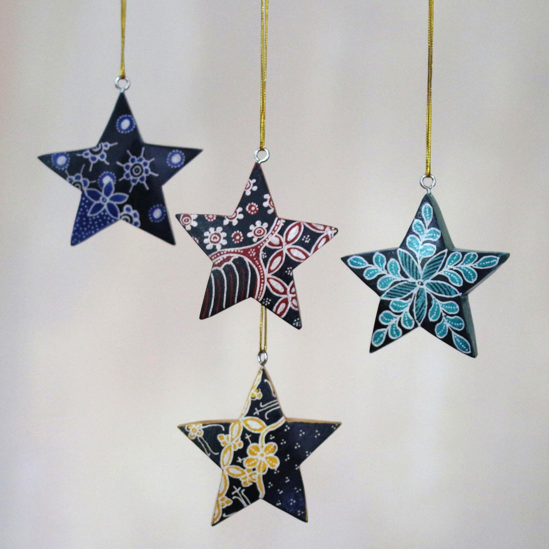 Four Batik Wood Star Ornaments by Artisans - Bali Stars