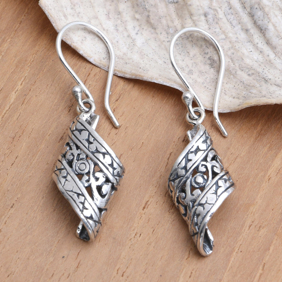 Curled like leaves and decorated with traditional Balinese motifs, Dewa Arimbawa's dangle earrings are instantly charming. Balinese artisans use sterling silver to hand craft the earrings, engraving the precious metal with openwork designs in a combination finish.