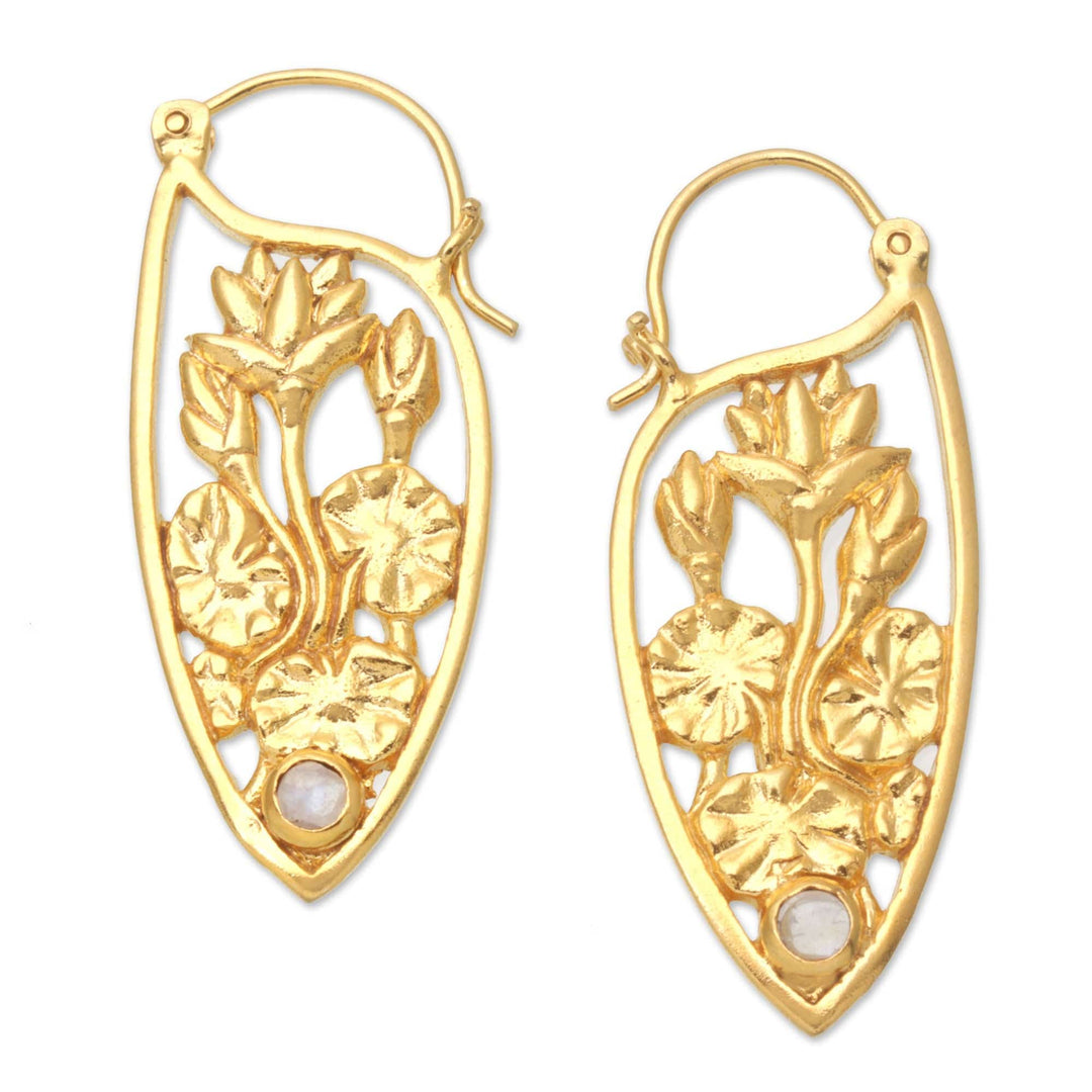 Lotus-Motif Gold-Plated Earrings with Rainbow Moonstone - Pond Lotus