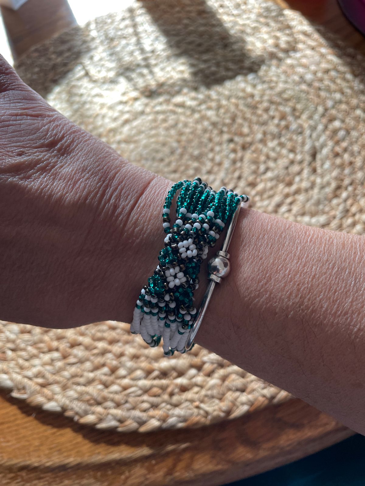 Green and Bronze Beaded Bracelet - Flower Harmony in Emerald