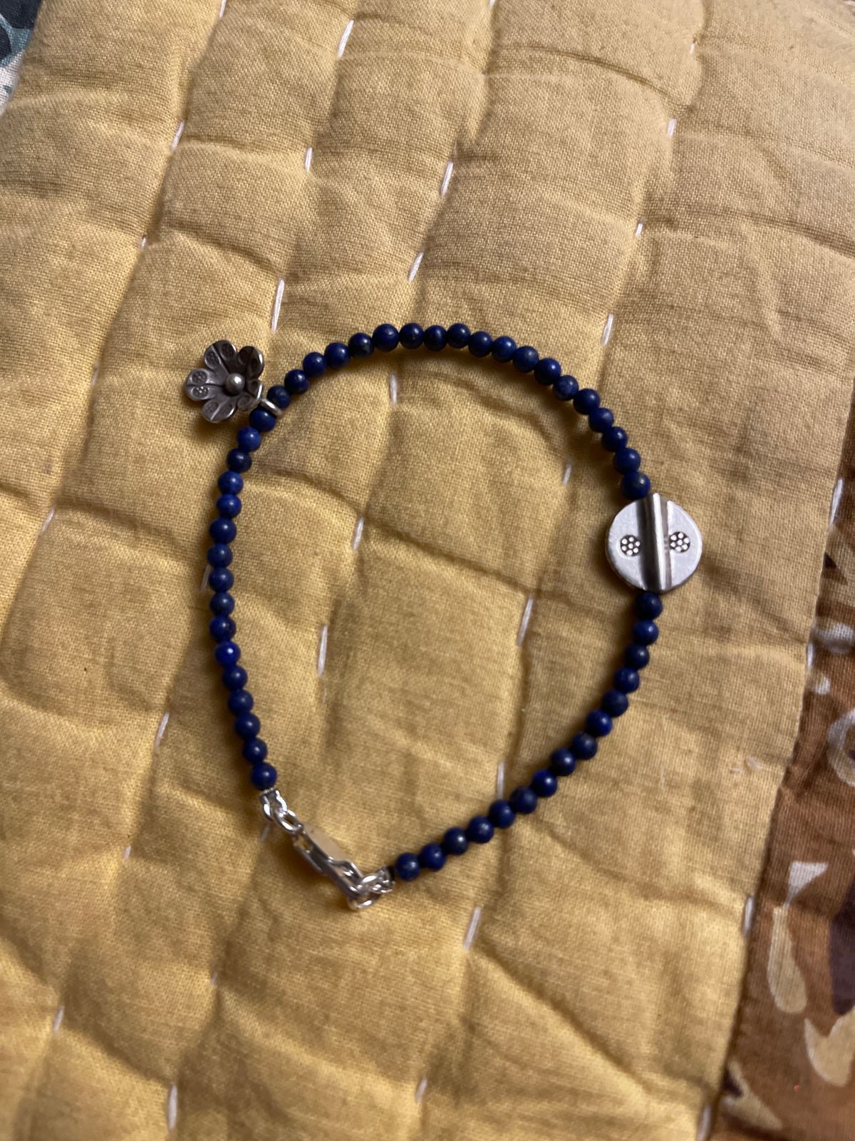 Thought to purify the soul, lapis lazuli is a mesmerizing gem; it flows around the wrist like a deep blue river. Somluck Komolmith crafts a bracelet of exquisite beauty, adding silver charms from Thailand's Karen hill tribe artisans.
