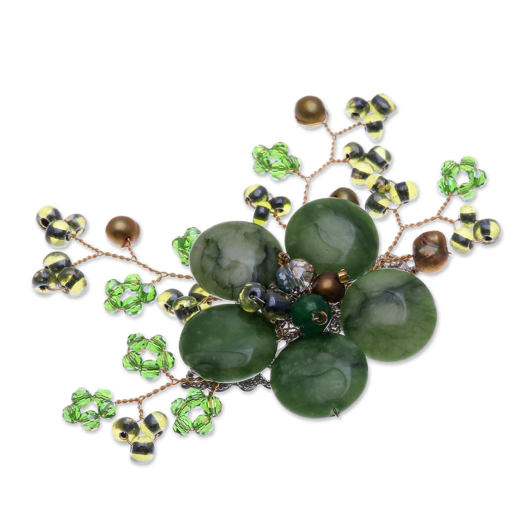 Let a spring of harmony and vitality blossom in your soul with this wondrous creation from the captivating Thai region. Nareerat explores the ethereal side of nature in this brooch pin, whose copper structure is crowned with quartz, cultured pearls and glass beads in a palette of green hues, each forming an enchanting flower.