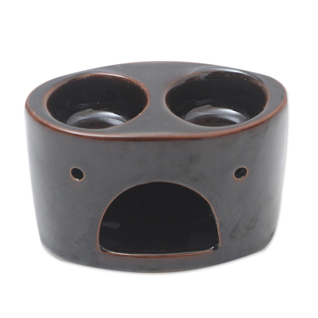 Crafted from dark brown ceramic, this oil warmer will diffuse wonderful fragrance throughout your home. Dewa Putra designs the oil warmer to feature the eyes of Buddha, half-closed in blissful meditation. A tealight candle can be inserted in the back, and the top features two vessels for fragrant oils.