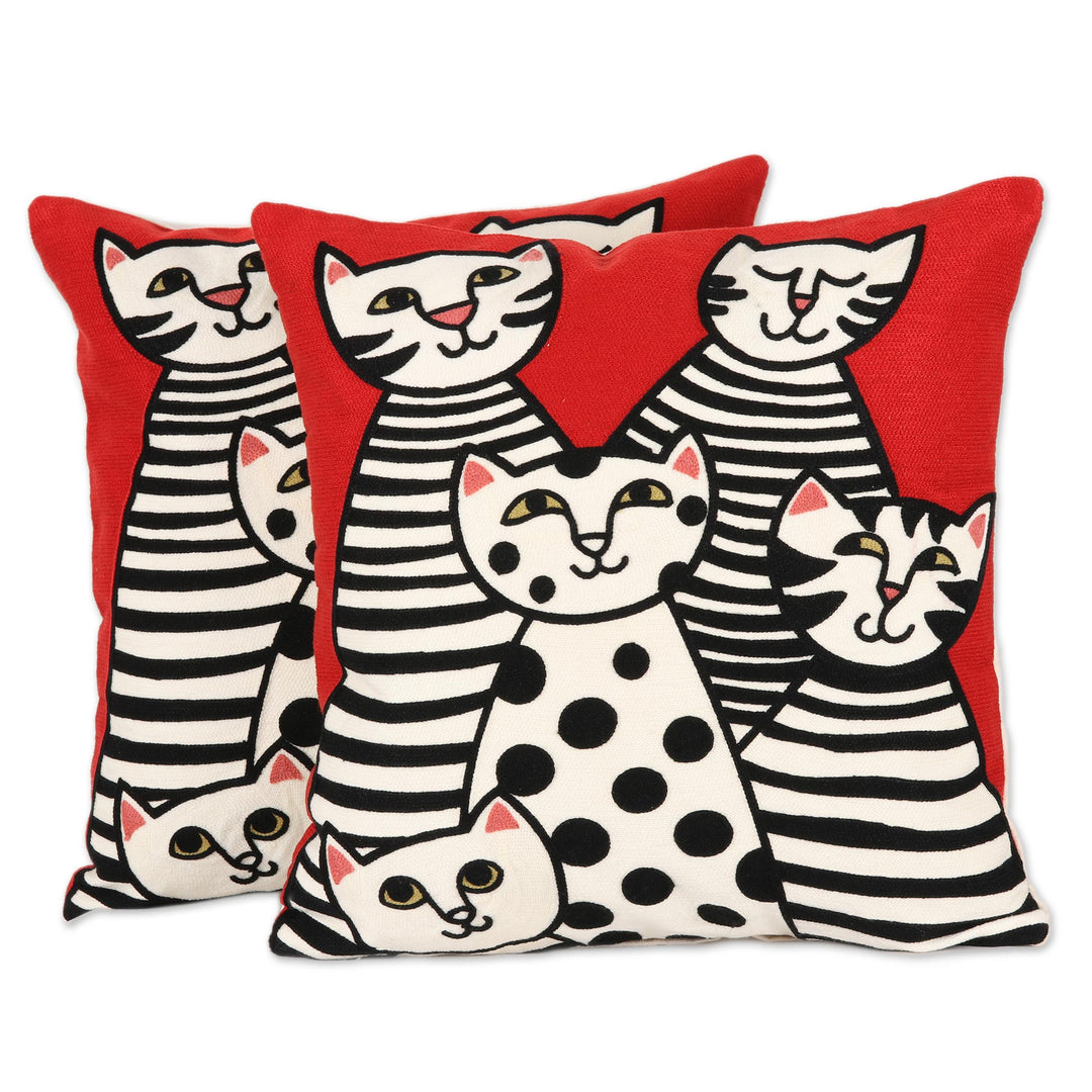 Cat-Themed Embroidered Cotton Cushion Covers (Pair) - Cat Family