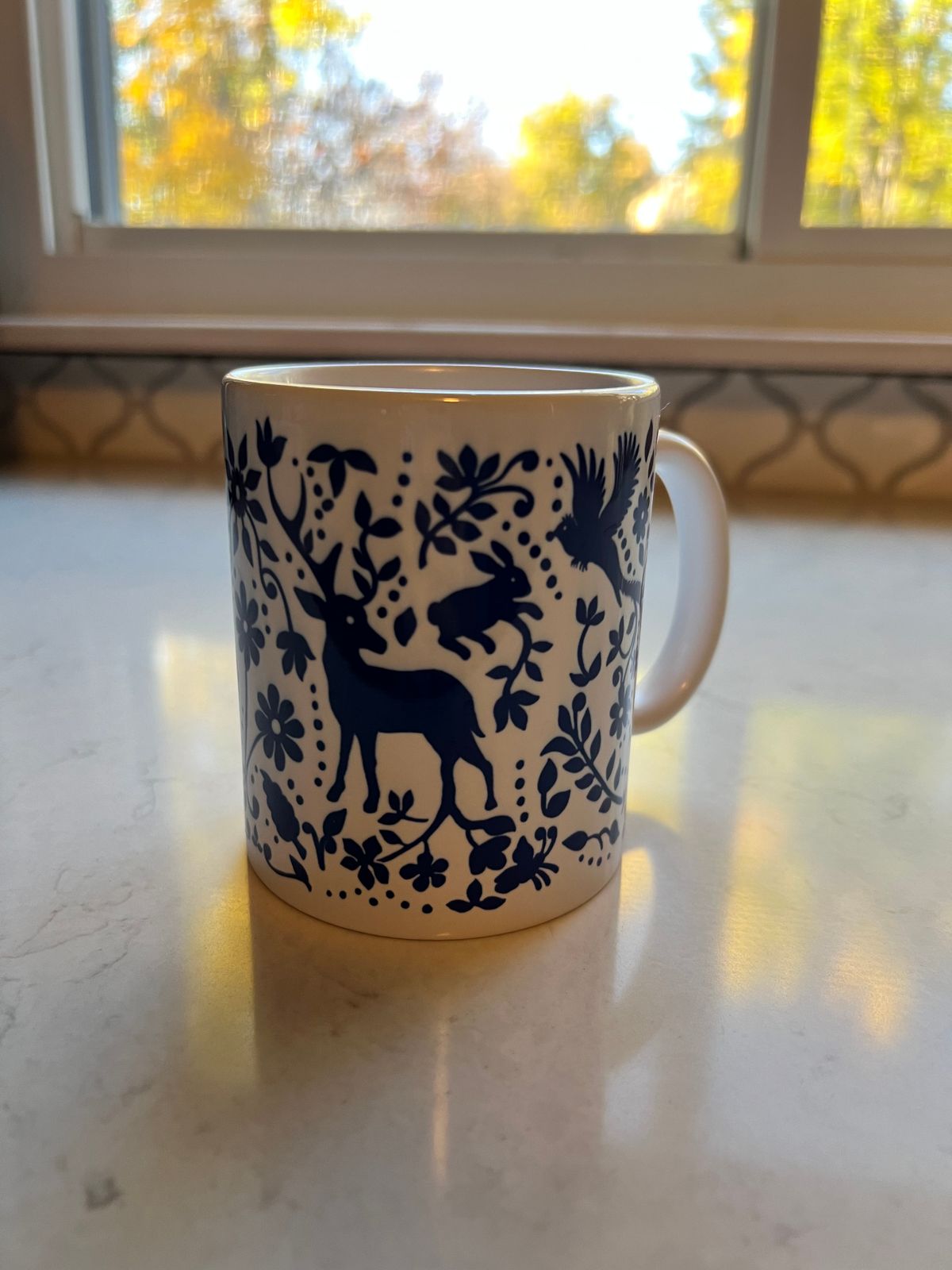 For this delightful ceramic mug, Alejandra Aceves depicts the motifs of the Otomi tenango — textiles covered with hand-embroidery on animal and plant designs drawn freehand on the fabric. Even cave art in the sierra of Mexico's Hidalgo state can come to life on these tenangos. The skilled artisans use a closed herringbone stitch now known as the Otomi stitch that shows only the outline of the patterns on the reverse side.