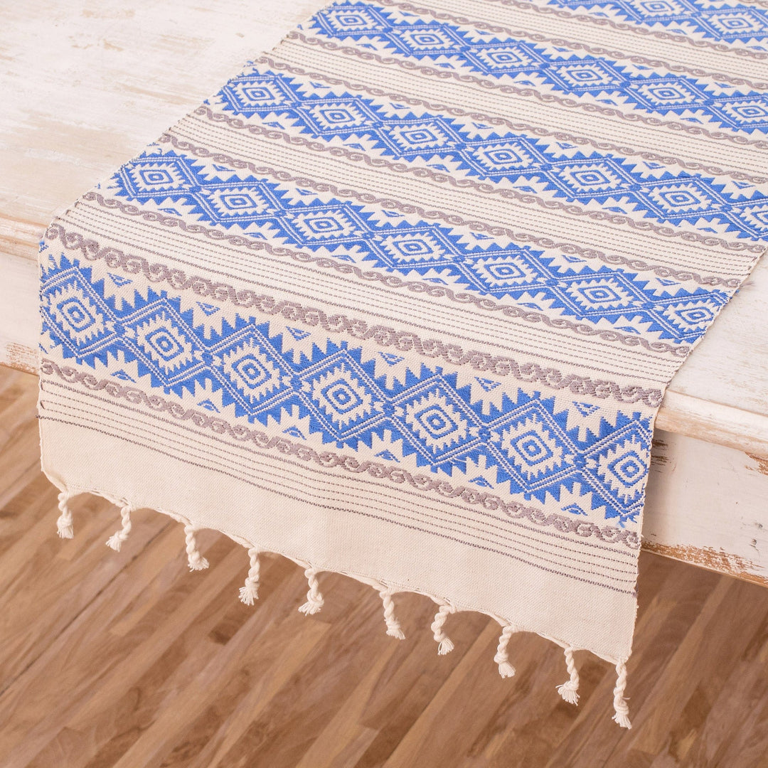 Everything you see in this spectacular table runner is meticulously crafted by hand: from the fabulous geometric patterns woven from cotton on a traditional pedal loom to the original knotted fringes that adorn both ends. This splendid decorative accent is handmade in Guatemala by the Women United for Artisan Development group in shades of royal blue, ivory and grey with traditional Mayan motifs as the inspiration behind it.