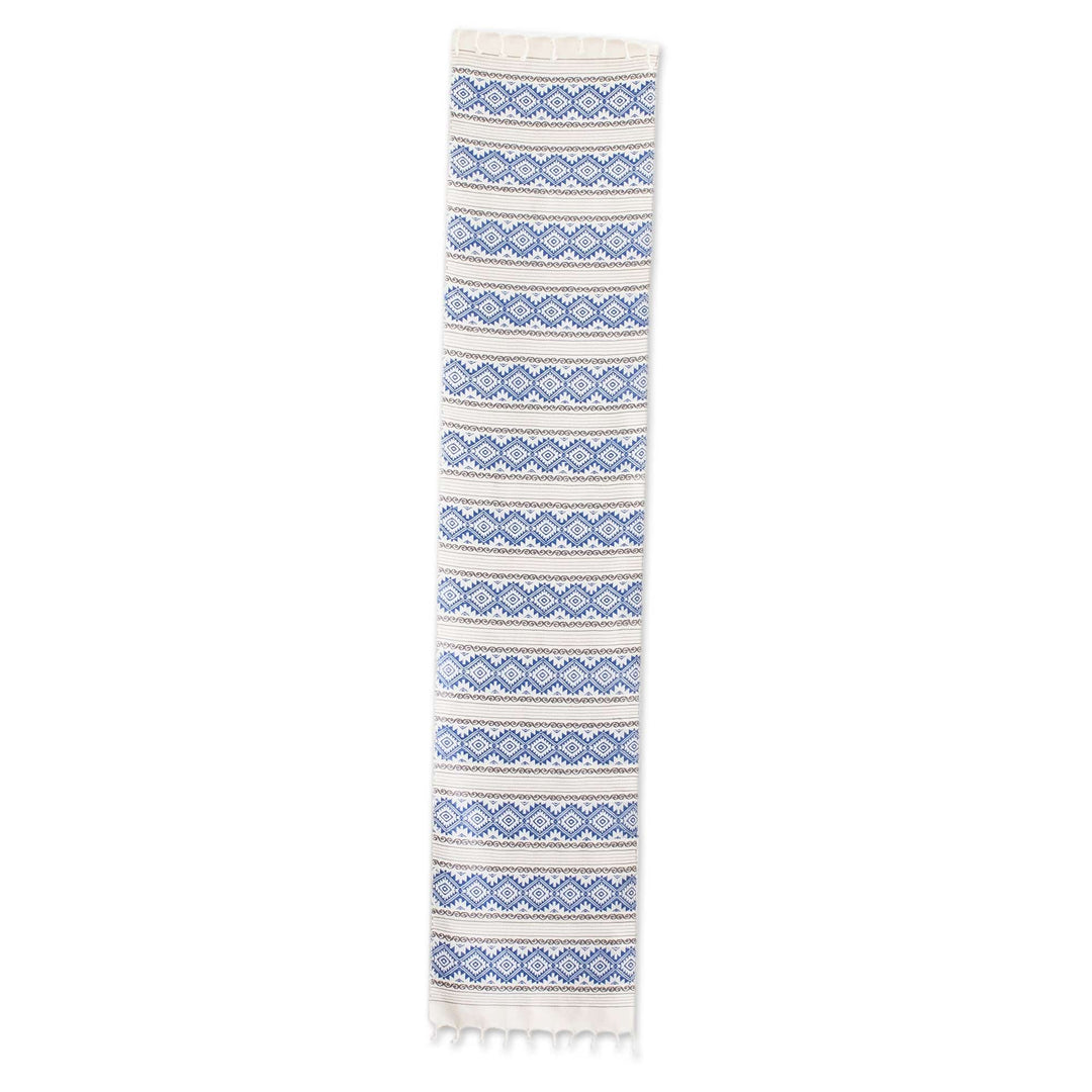 Fringed Cotton Table Runner in Blue Ivory & Grey - Azure Diamond