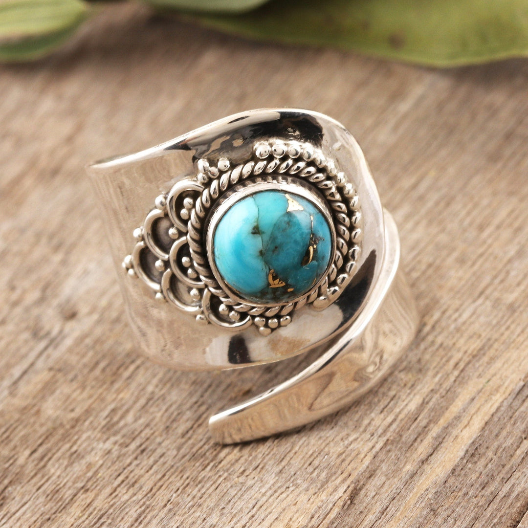 Scalloped motifs like the scales of a fish--or a mermaid--adorn a sleek wrap ring from Rakesh Rana in India. The sterling silver ring is accented by a cabochon of composite turquoise in a beguiling shade of blue.