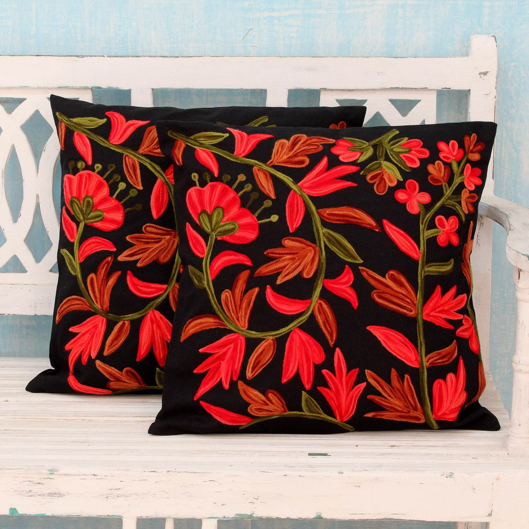 2 Chainstitch Embroidery Black Cotton Floral Cushion Covers - Poppies at Midnight