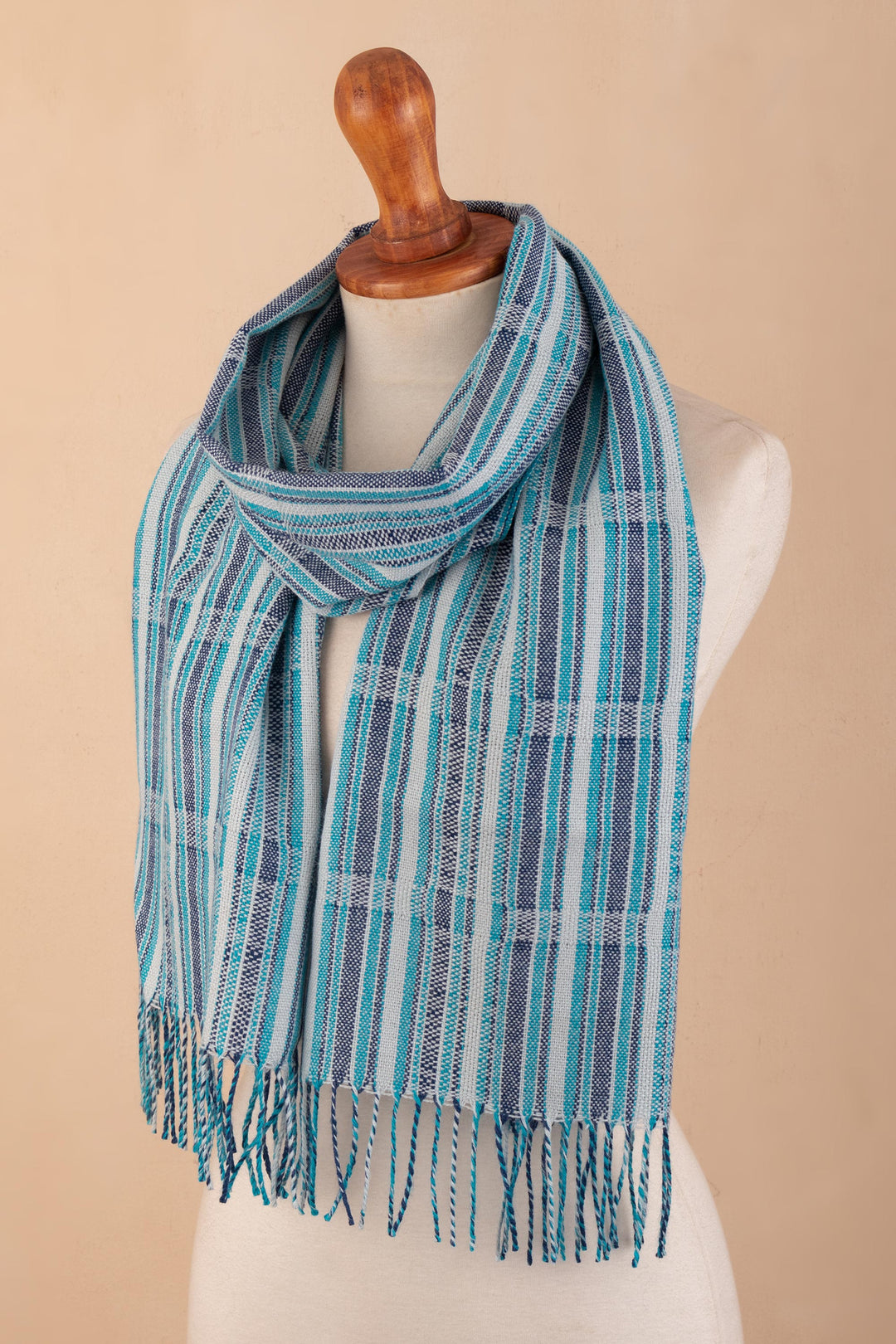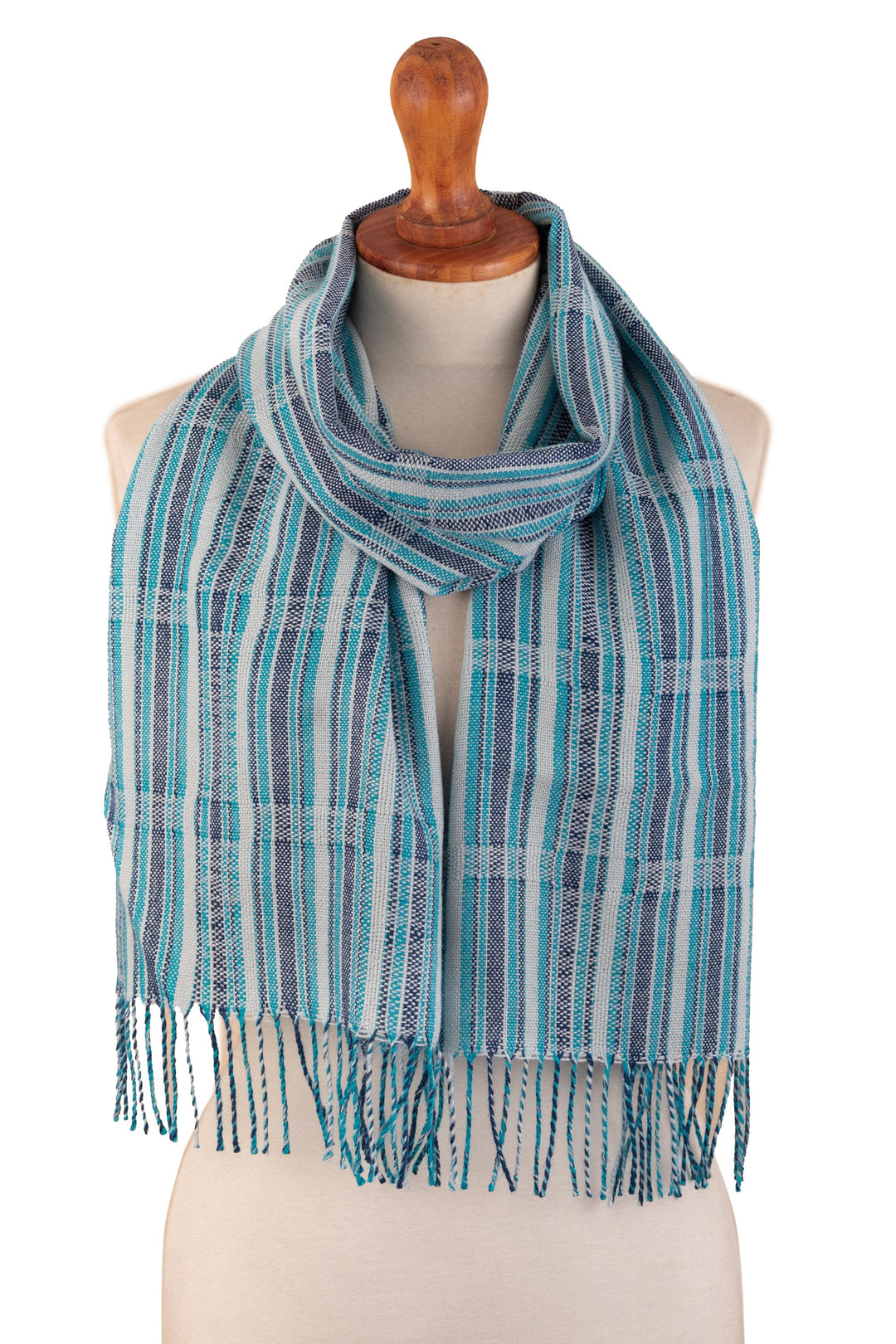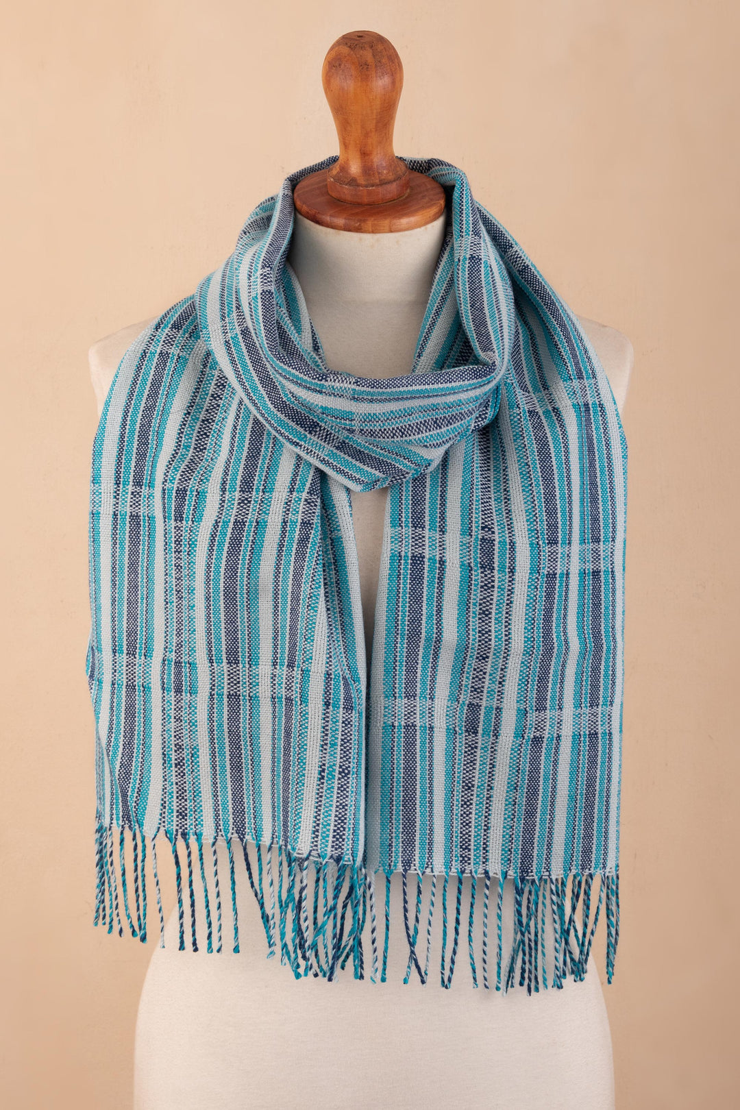 Working on a traditional loom, artisans weave this beautiful and toasty scarf. Wilmer Vilchez in Peru designs the scarf, which is crafted from soft baby alpaca wool in cool blue shades. Baby alpaca is the finest fleece from the first shearing of the season.