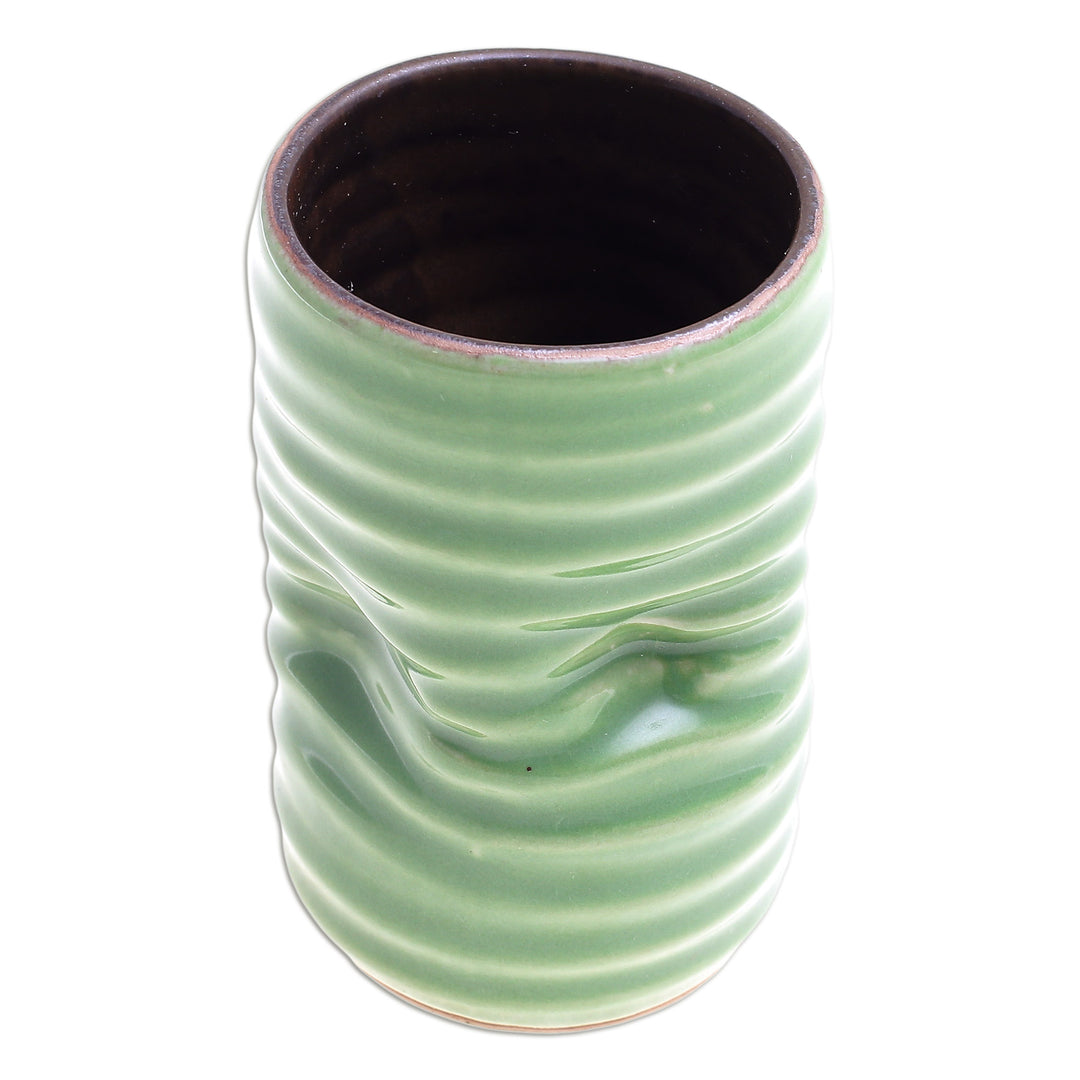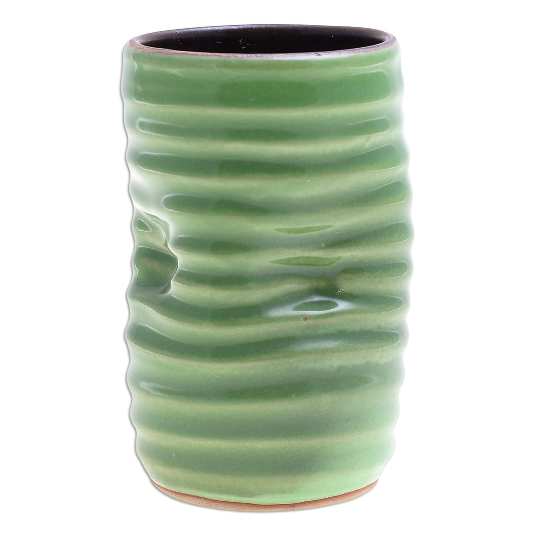 This unique ceramic cup is crafted by hand for a wonderfully organic vibe. Duangkamol in Thailand crafts the small tumbler with a ridged surface and a leaf green glaze.