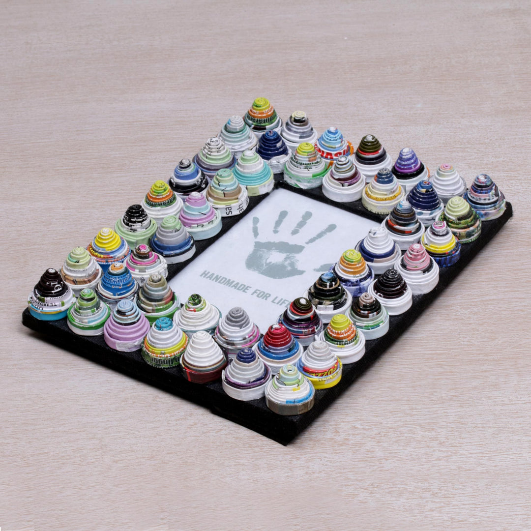 Riris Simanjuntak reflects on the majesty of India's temples, decorating this rectangular photo frame with a city of mesmerizing spires. The photo frame is handcrafted of multicolored recycled newspaper for a striking, eco-friendly addition to any home.
