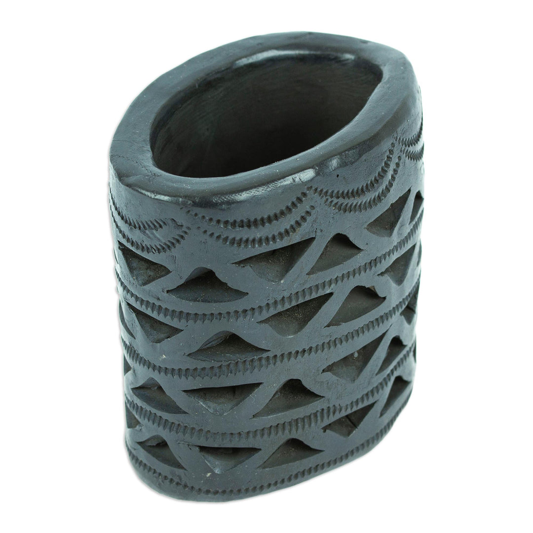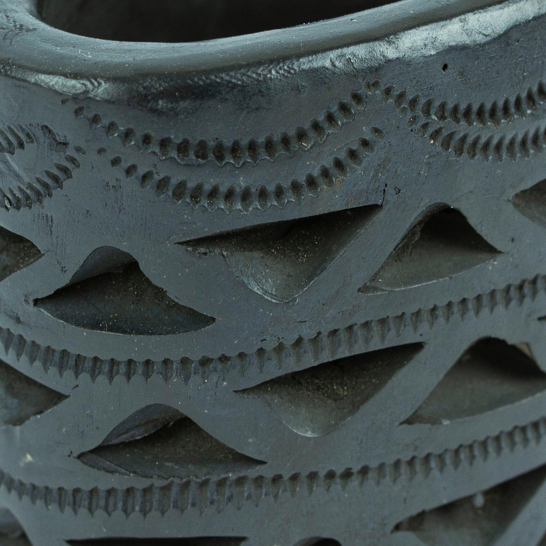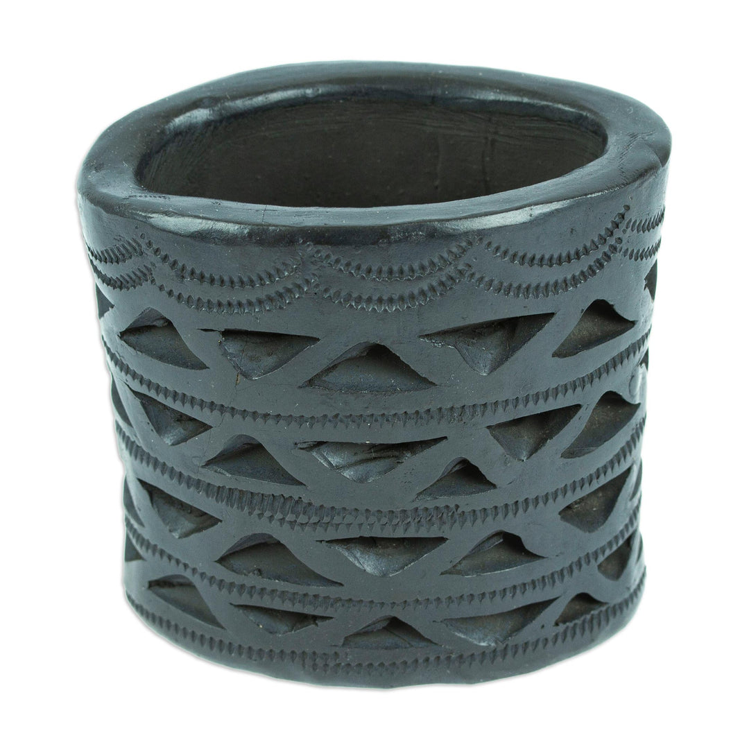 Half diamonds are the theme for this hand-carved oval mini flower pot made from barro negro or 'black clay' which has been used in the Mexican state of Oaxaca for centuries. You can display small flowers and plants in this wonderful ceramic pot designed, crafted and carved by Fernando and Magali Pedro in Mexico.