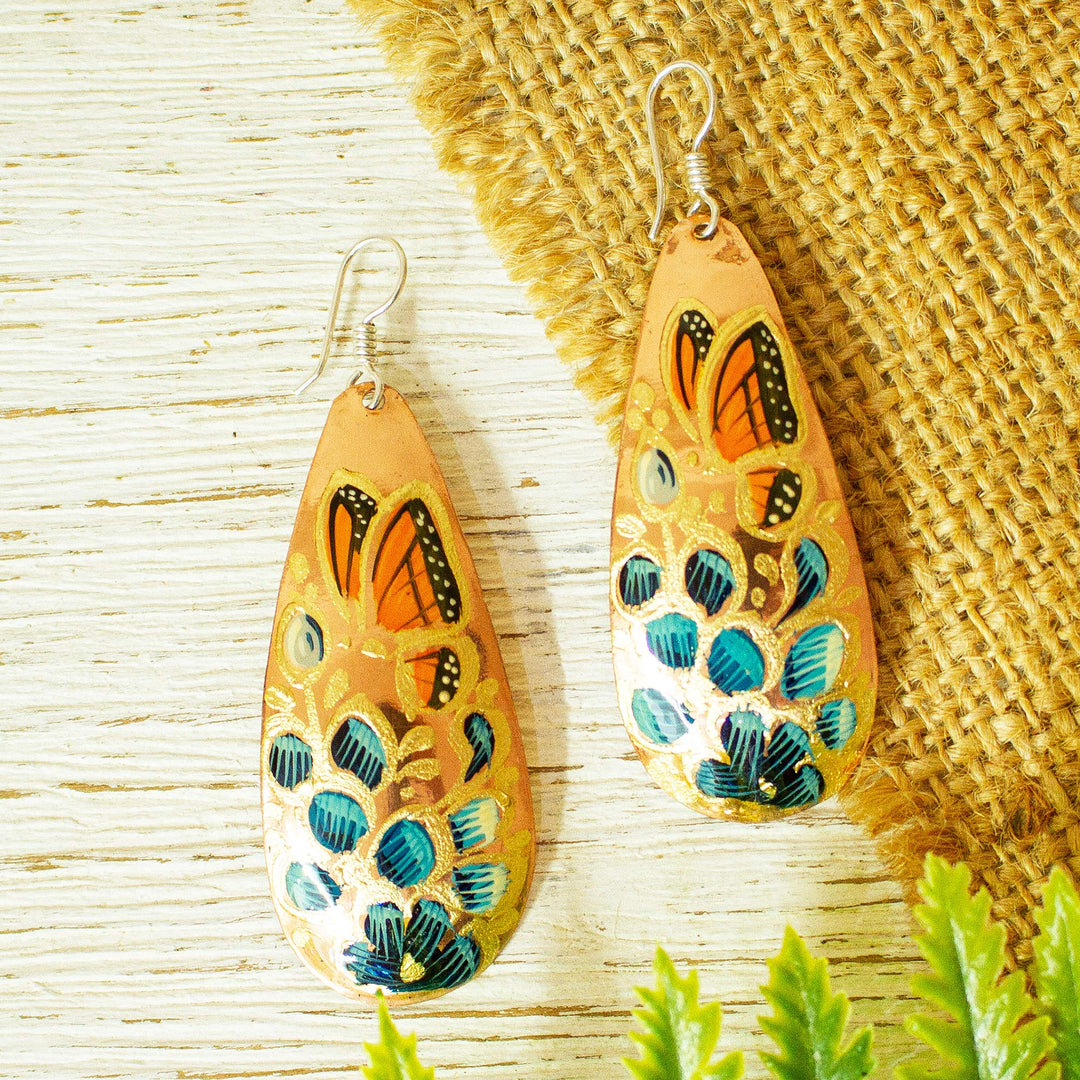 Rosy and Daniel celebrate the beautiful monarch butterflies that migrate each year from Canada to spend the winter in Michoacan. They craft colorful dangle earrings from reclaimed copper and paint the intricate motifs by hand in gold, orange, teal, and sky blue tones.