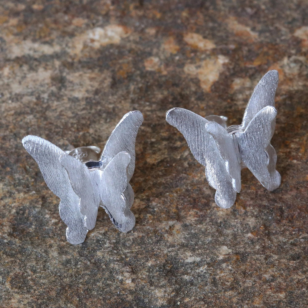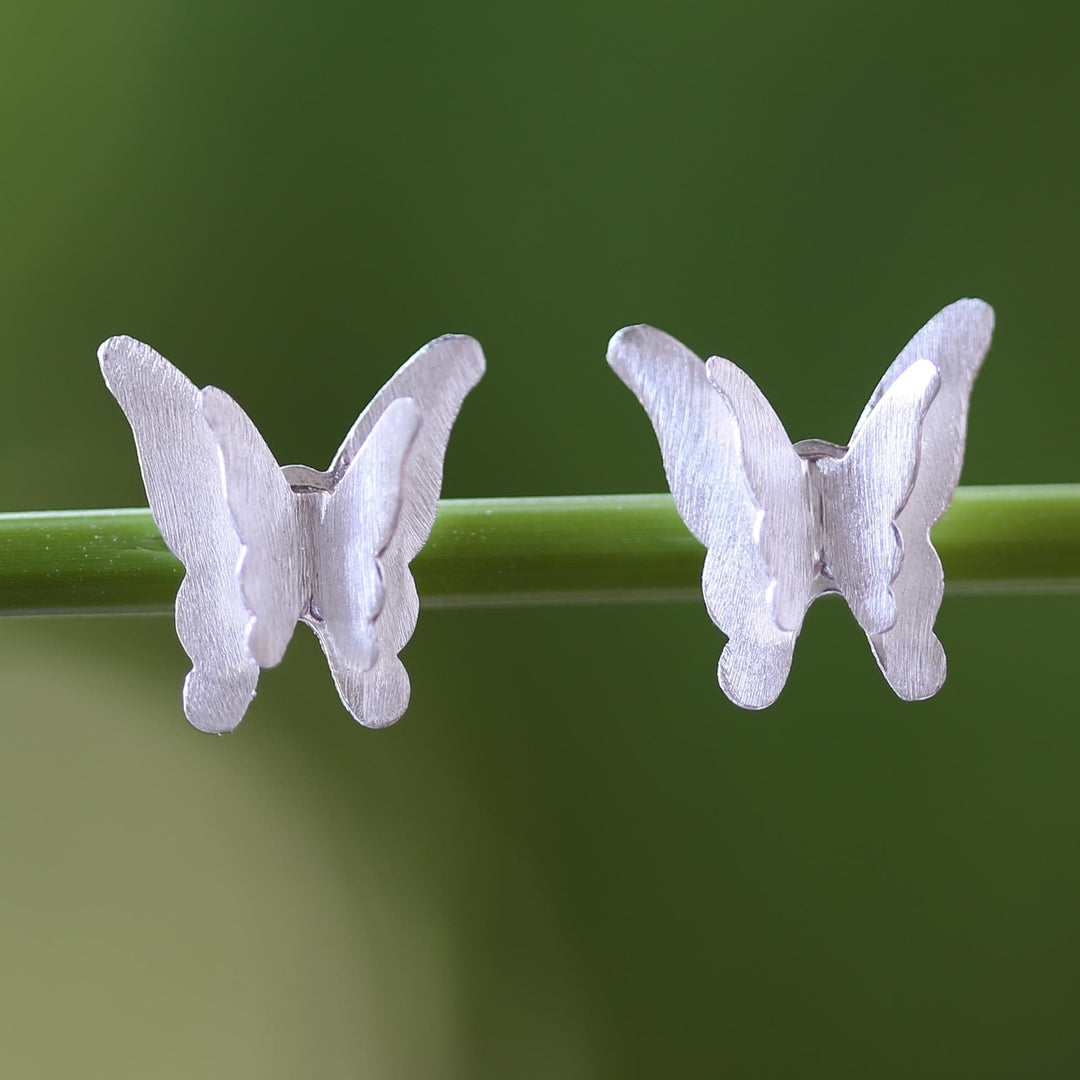 The three-dimensional design of these butterfly earrings is by Lalana. The Thai artisan works in sterling silver, giving the earrings an elegant brushed satin finish.