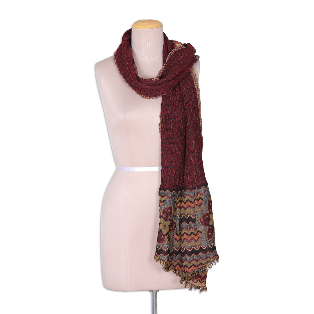 Floral Embroidered Colorful Burgundy 100% Wool Scarf - Sacred Blooming