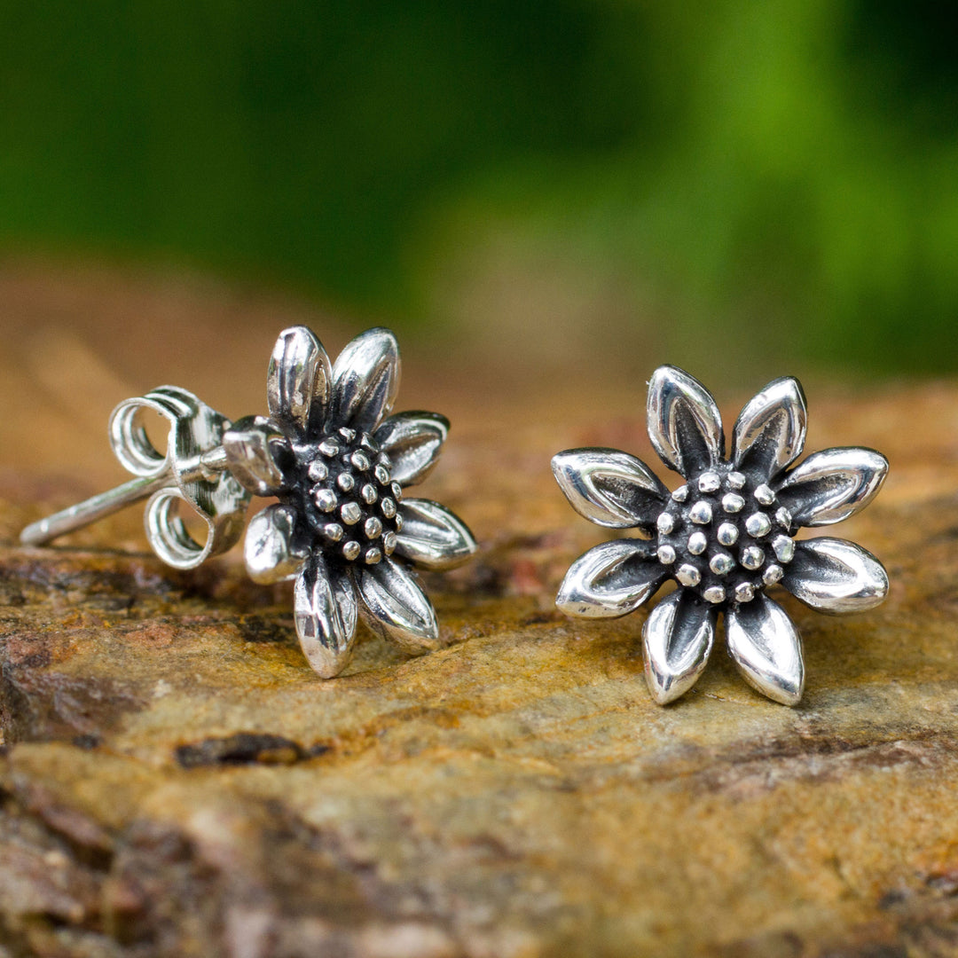 Small Sterling Silver Sun Flower Post Earrings from Thailand - Sunflower Love