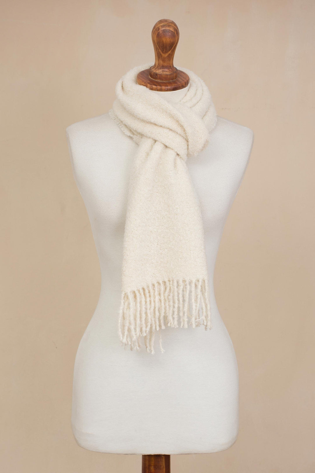 Add the delight of the Andes to your home with this wrap scarf from Peru. Designed by Isidoro C'cahuantico, the warm scarf is woven of soft 100% alpaca wool, featuring a solid color in bone. Lovely fringes complete the scarf at each end.