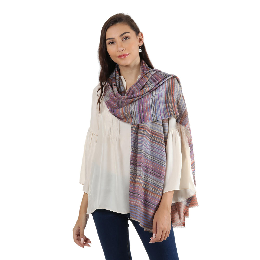This 100% wool shawl from Indian designer Sajad features horizontal stripes in shades of purple, brown, and orange. Sajad designs and creates the shawl on a traditional Indian handloom.