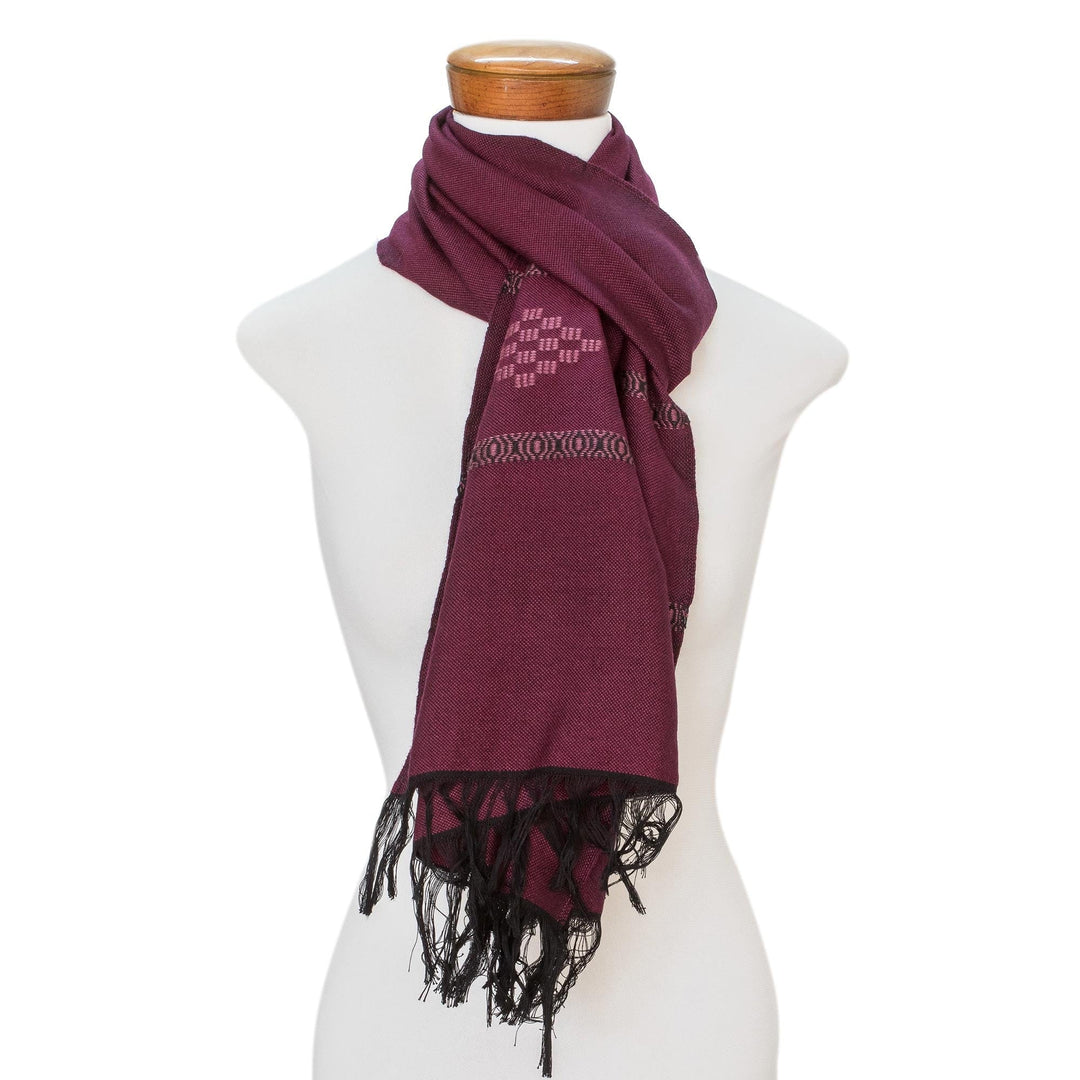Miguel Hernandez of Guatemala hand weaves a chic cotton blend scarf with a touch of the traditional. Woven with a blend of boysenberry and orchid purples, near each end of the scarf are two horizontal bands of light purple and black in an oval and cross pattern that frame a row of light purple large, checkerboard diamonds. Delicate black fringe completes the scarf.