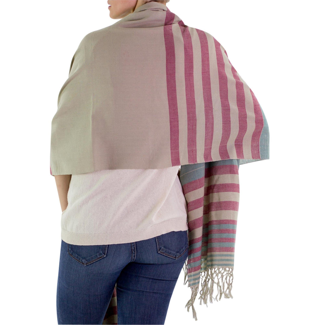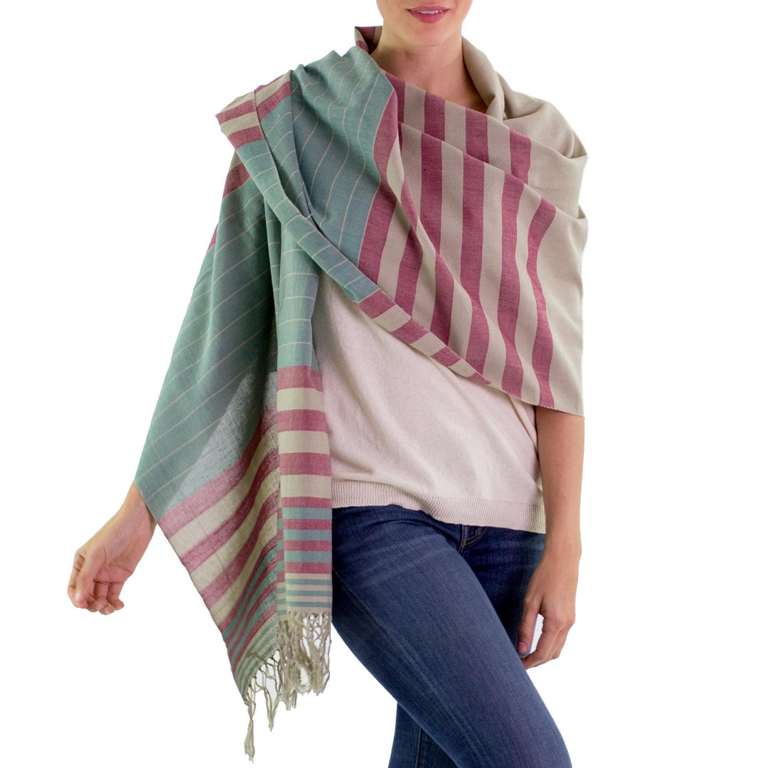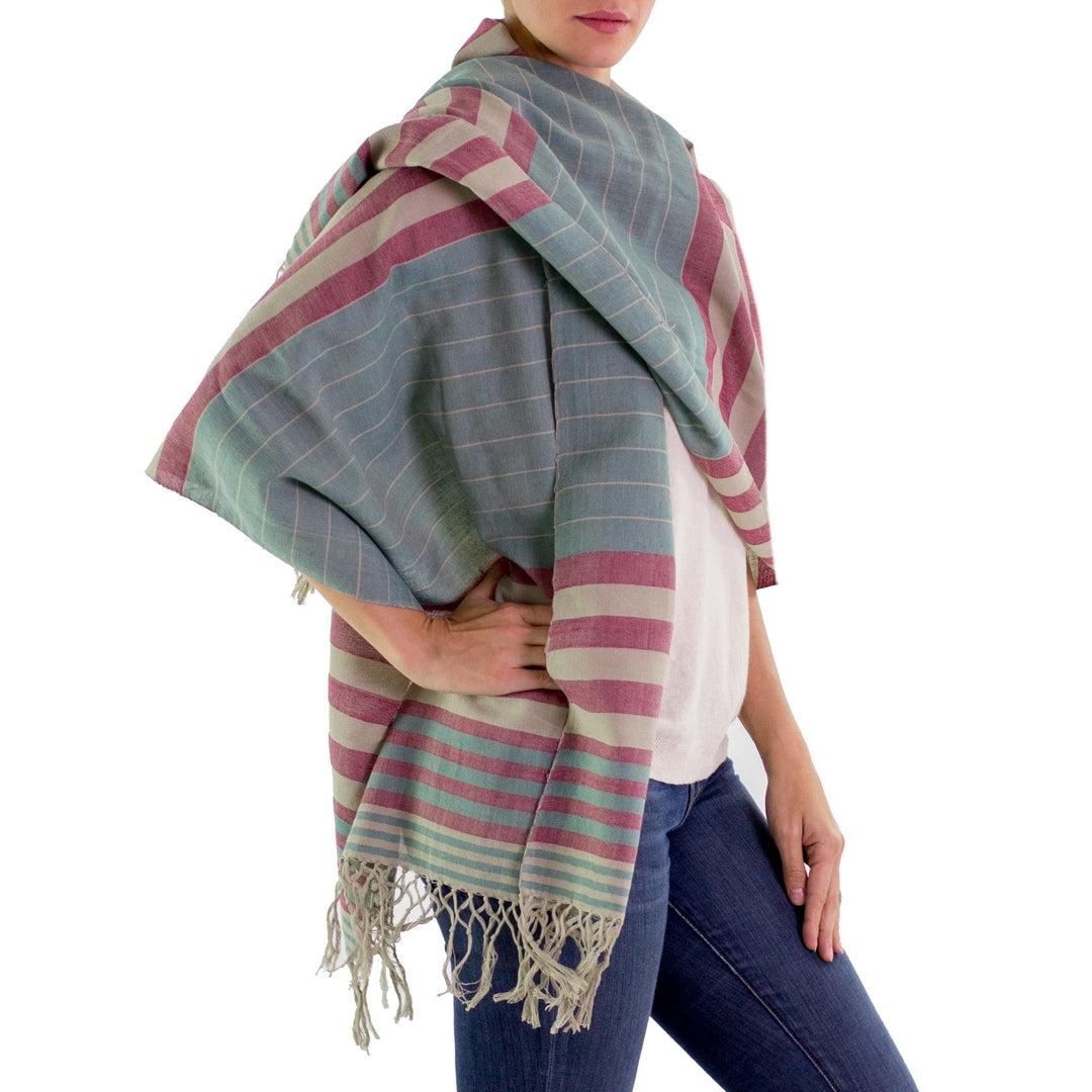 Yama Aj Chixot Artisan Group proudly preserves Guatemala's textile tradition with the modern design of this shawl. They work on the pedal loom, which requires a laborious process to prepare the loom for the striped patterns. This lightweight cotton shawl is woven in shades of maroon and turquoise underscored by pastel olive green.