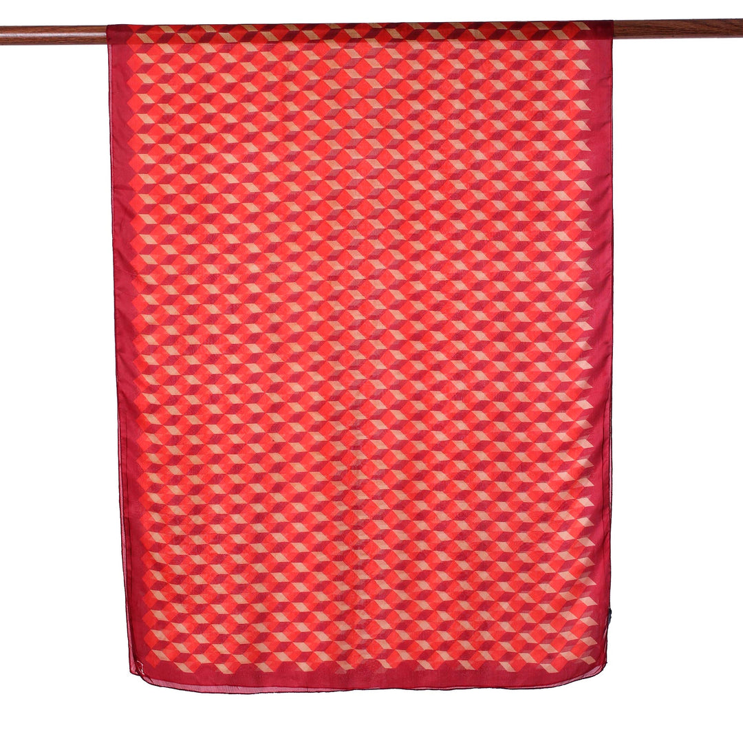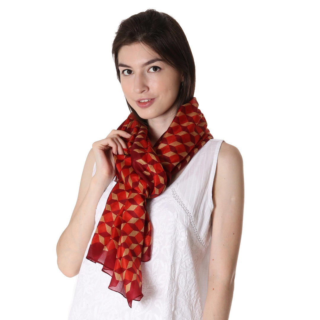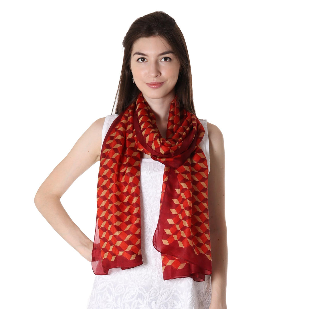 Geometric steps in colors of claret and sand create a mesmerizing illusion across this Indian shawl, woven from silk for an unforgettable accessory. Sajad designs the shawl, applying the designs using the screen printing technique.