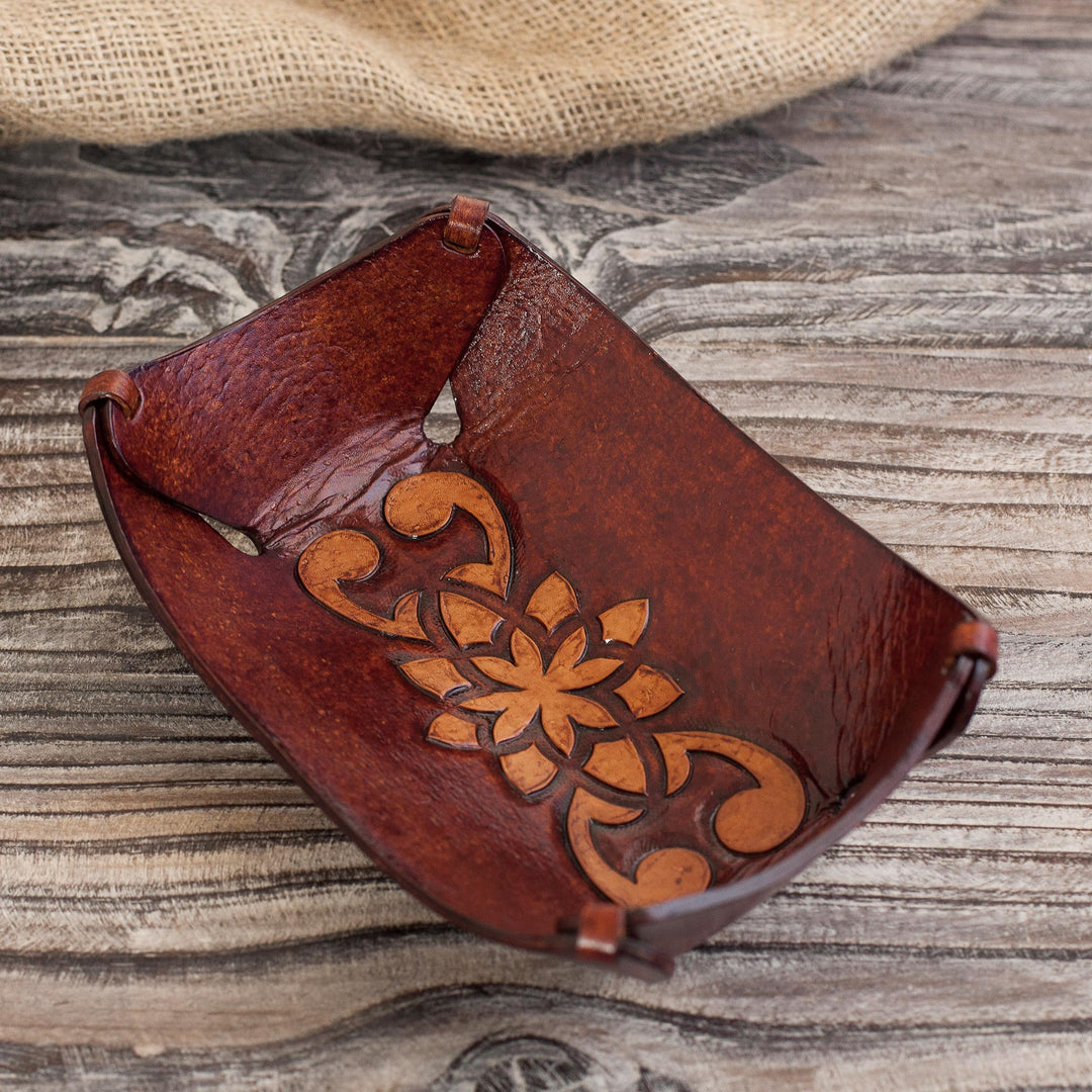 Leather Catchall in Honey Brown Artisan Crafted in Peru - Floral Star