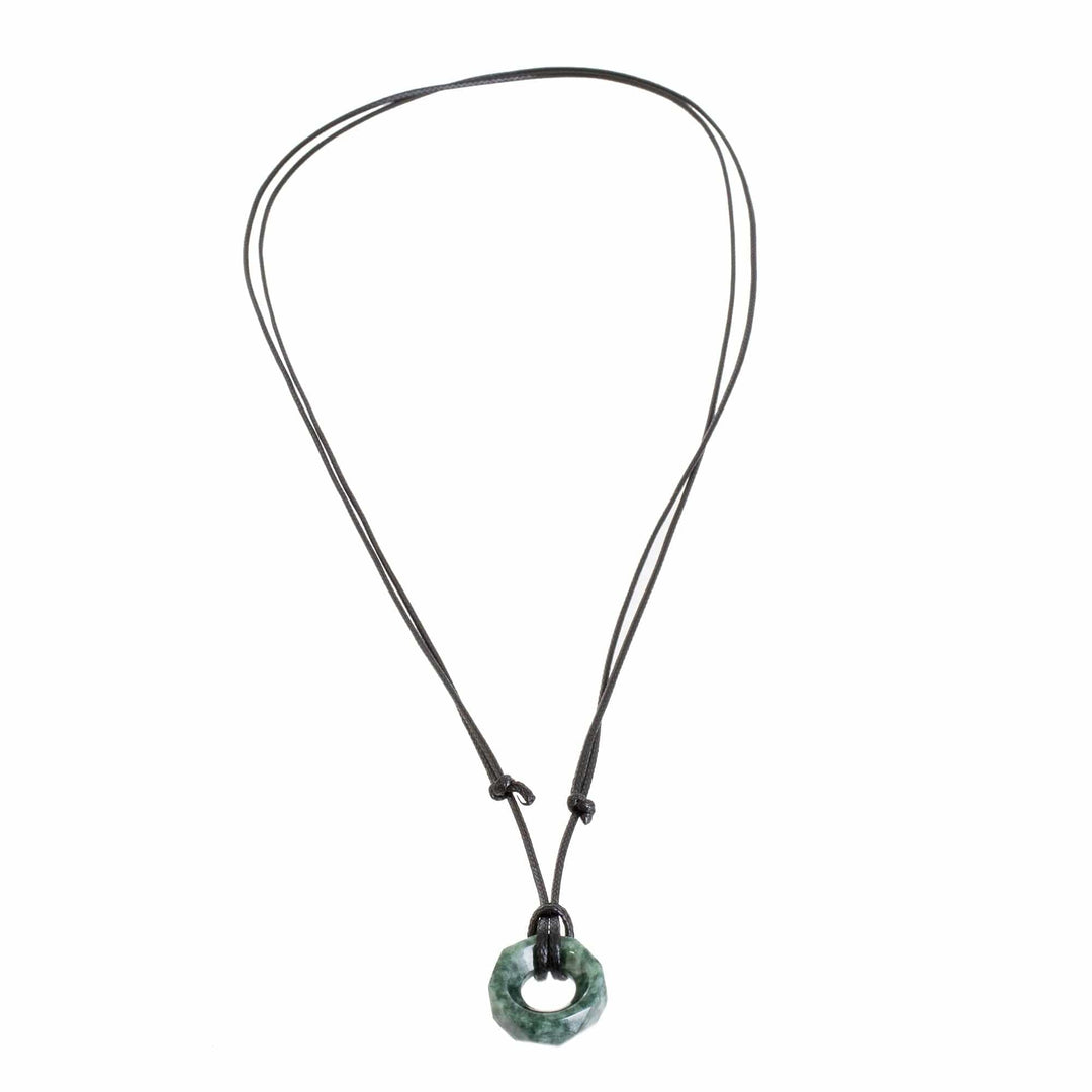 For the indigenous people in pre-Hispanic times, jade, known as ya'ax chich, represented life, fertility, and power. Guatemalan artisan Zandra Lorena Sajbin works with this ancestral stone, which showcases natural green tonalities. She hand-carves a pendant to feature a hex ring with faceted edges and sets it on an adjustable length of black cotton cord.