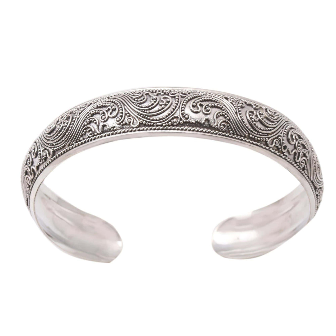 Climbing leafs bend under argent dew drops, their arched form lending dynamic grace to this sterling silver bracelet. Inspired by Bali’s exotic climbing plants, or bun, this cuff bracelet is an exquisite blend of contemporary and past artistry. Made Sriasih designs and crafts this piece as she reminisces on her father’s teachings. To complete the elegant allure of this piece, Sriasih presents this bracelet in a batik covered box, lined with velvet and finished with palm leaf thread. The box also features a mirror. An ideal accessory for stunning dressing.
