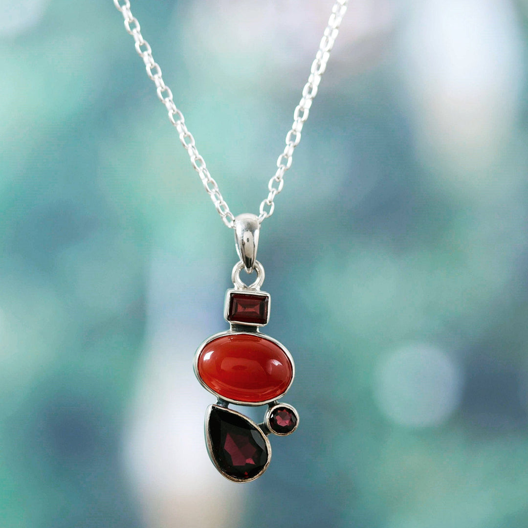 Exquisite jewels create an abstract accent in Shanker's pendant necklace. Crafted in the luxurious lands of India, this sterling silver design draws inspiration from modern trends, creating a gorgeous pendant whose red color scheme reunites a natural carnelian cabochon and faceted garnet gems, totaling over three carats full of elegance and uniqueness.