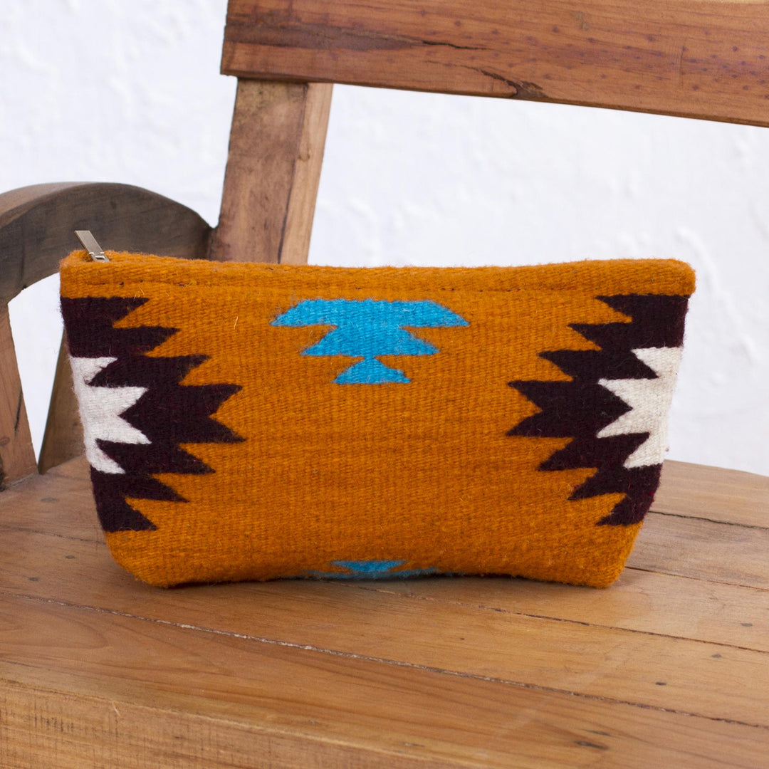 Mexican artisan Marco Bautista finds a true passion in the act of weaving, a process that brings him closer to nature, reminding him of the relationship he shares with the animals and landscapes of his country. He creates this clutch handbag with a handwoven Zapotec design from 100% wool. He decorates the piece with geometric motifs in antique white, black, and Caribbean blue against a body of sunrise orange. The handbag opens with a zipper to reveal a polyester lining in black with an open side pocket.