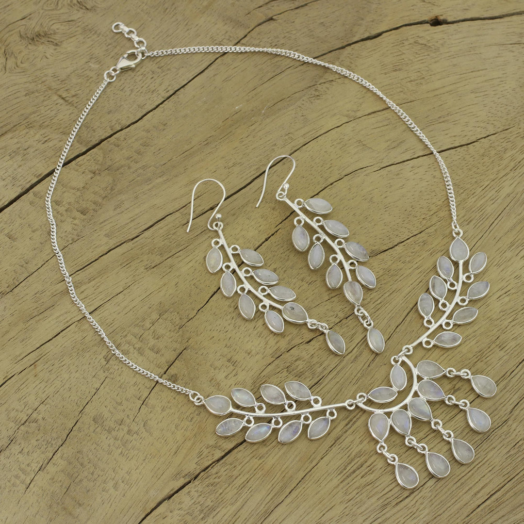 Silver branches host glowing leaves that fall in a dazzling cascade. Handcrafted, this set by Neeru Goel features the innate allure of natural rainbow moonstone. Three lavish fronds center the sterling silver necklace, while matching earrings complete the ensemble.