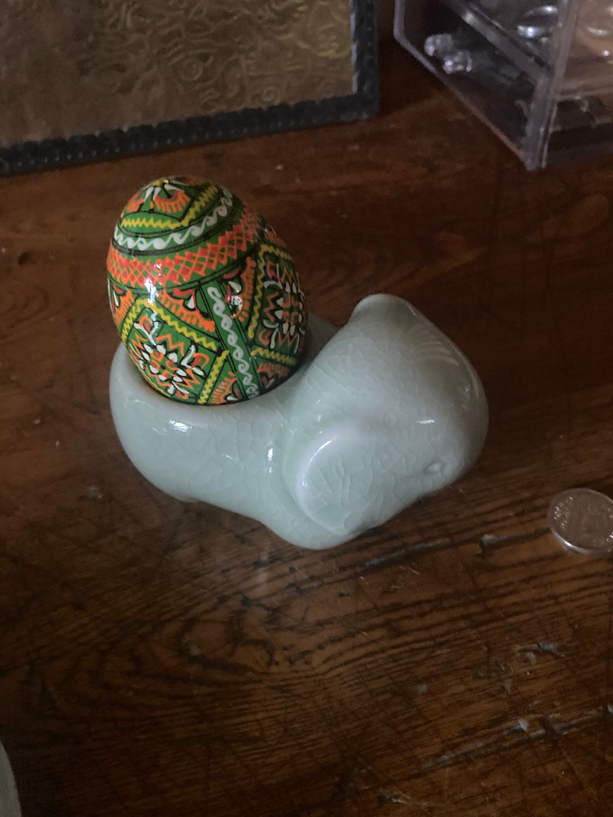 This perfectly adorable egg cup is created by Thai artisan Penpan using traditional celadon ceramic techniques. The elephant-shaped cup features a cool aqua glaze with celadon's characteristic crackled finish.