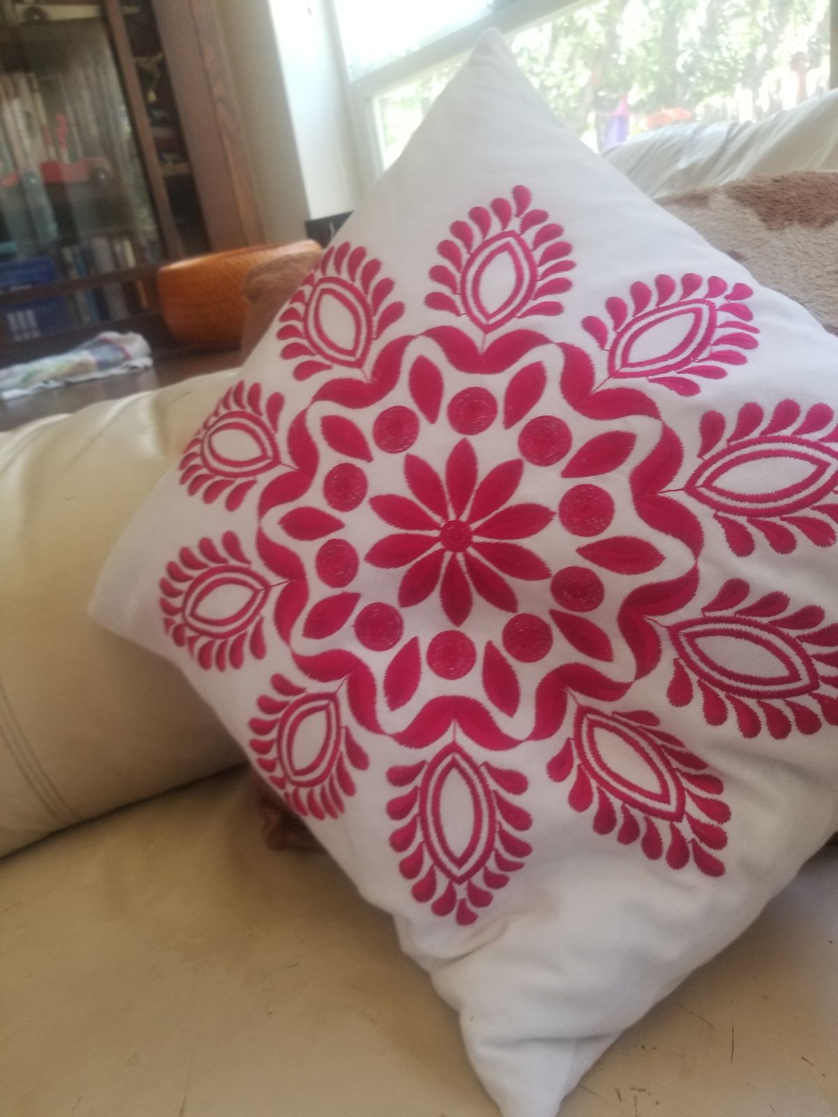 Hot pink flowers bloom in splendor on pristine white cotton. From Asha Prabha, two cushion covers feature lavish machine embroidery, while the reverse side is solid white.