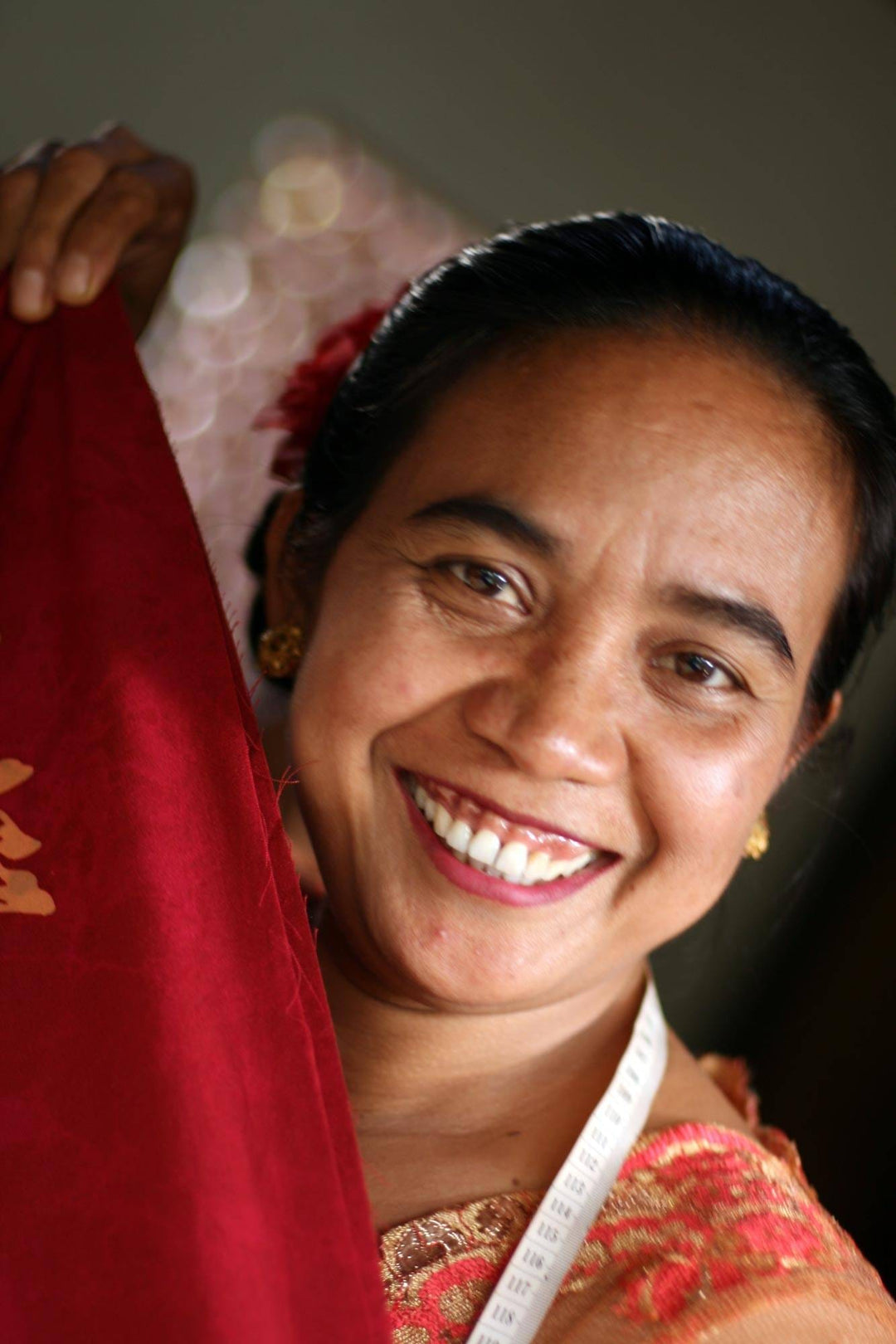 A mother of three children, Nyoman Nadri was born on May 2, 1965. She is an artisan of bed covers, pillowcases, sarongs, shawls, and many other textile arts. She started her career in embroidery in 1987, taking orders to make pillowcases and bags from 1989 until 1992. In 1995, she turned to batik when she learned it from a friend. She has worked hard for years to become as skilled as she is now – to have an art workshop and people working with her had never come to mind before. A tremendously creative woman, she creates imaginative patchwork while ensuring her children's loving upbringing.