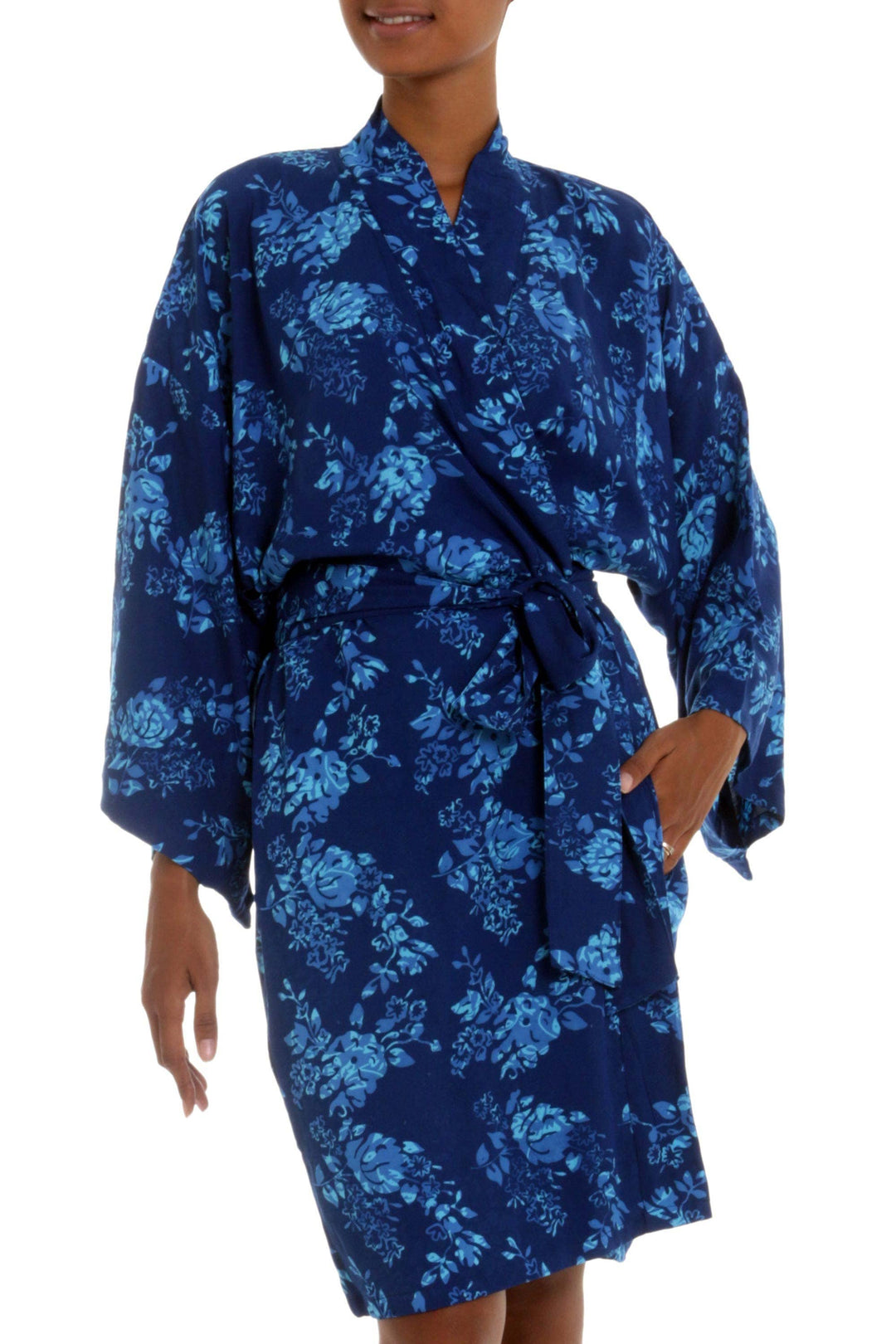 Gorgeous flowers in cerulean blue shower this robe with tropical elegance in a design by Bali's Nyoman Nadri. She creates this graceful rayon robe with wide sleeves and a matching belt. In traditional kimono style, the robe features openings under the arms for adjusting the robe and for ease of movement.