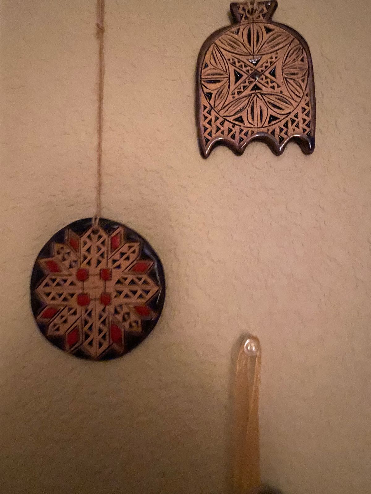 The Armenian region has a rich spiritual history where artistry and faith have merged to create traditional amulets of sublime allure. Part of the artisans who continue this long tradition, Shahe Harutyunyan presents this stunning ceramic amulet, whose round shape encloses a classic geometric floral pattern where indigo and red hues unite to symbolize beauty. The home accent is also equipped with a jute cord, allowing you to add its mystic glory to any interior.