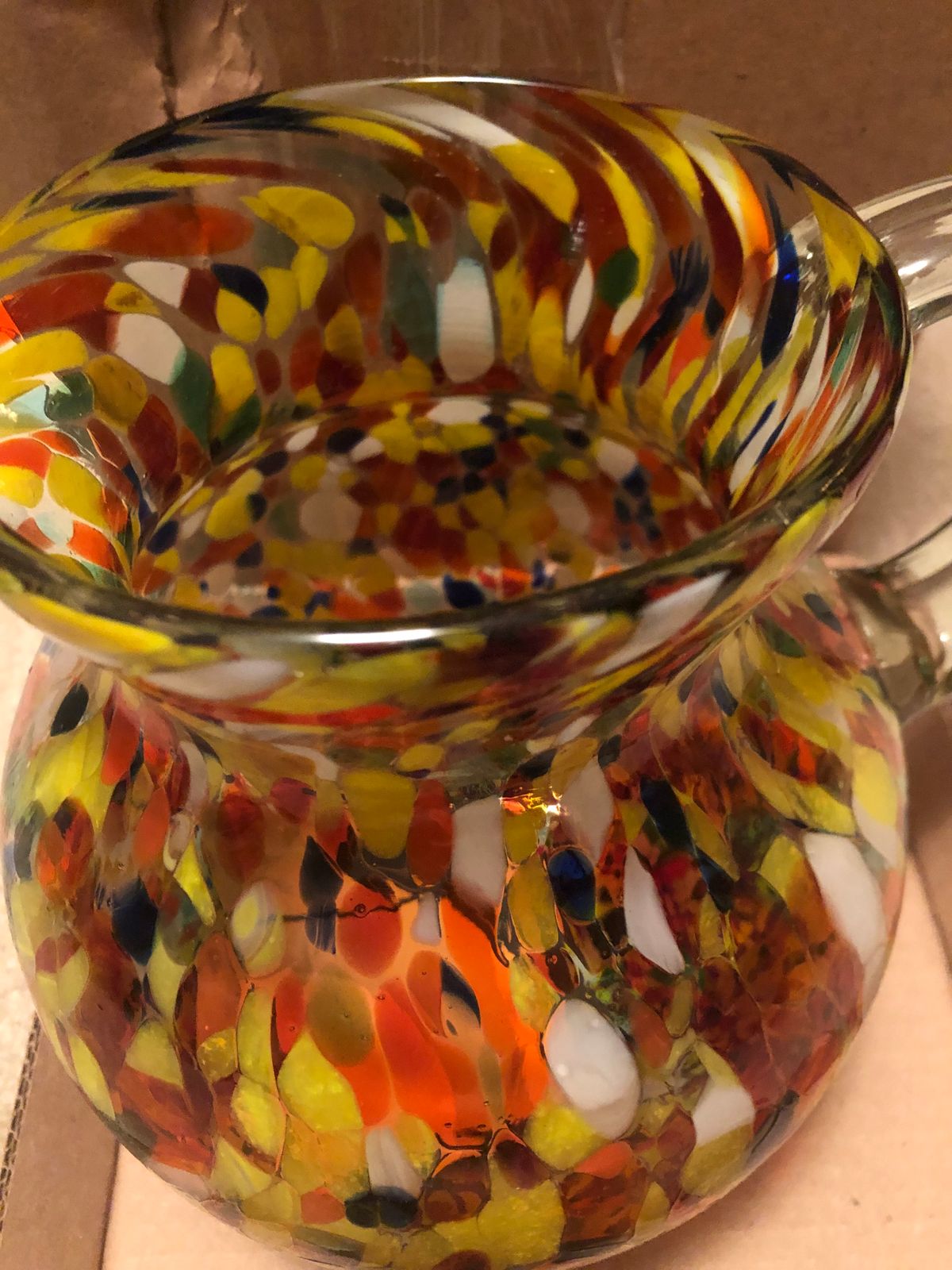 Blown glass reveals bright confetti in its crystalline curves. Recycling glass, artisans create a pitcher in fiesta colors for the Novica Handblown Collection. Crafted by hand using glass-blowing techniques perfected over many years, it is a unique example of their art.