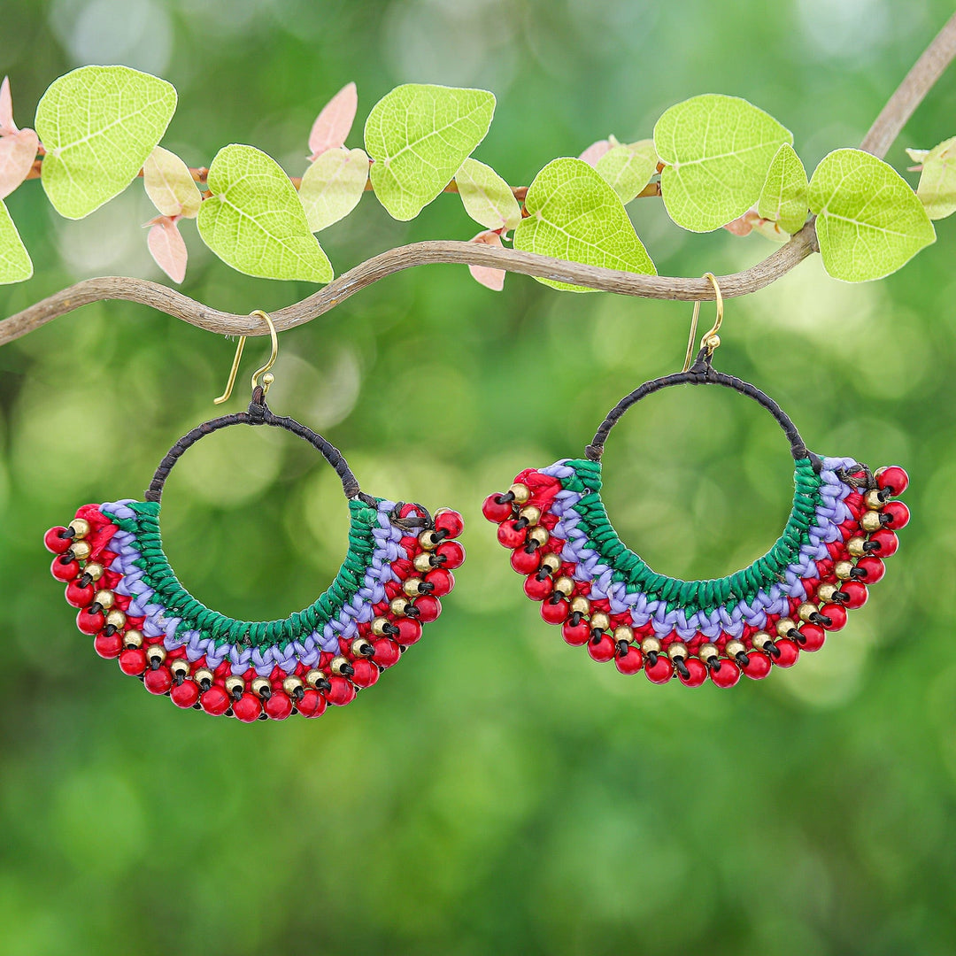 Awake to the light and style of a marvelous creation made to enhance your bold spirit. Thailand's Tiraphan Hasub works with traditional macrame techniques and waxed polyester cords to create these dangle earrings, equipped with gold-plated hooks and red magnesite beads as a symbol of courage. The handwoven pieces—crowned with brass accents—also feature a palette of green, purple and red hues, evoking the colors of an audacious soul.