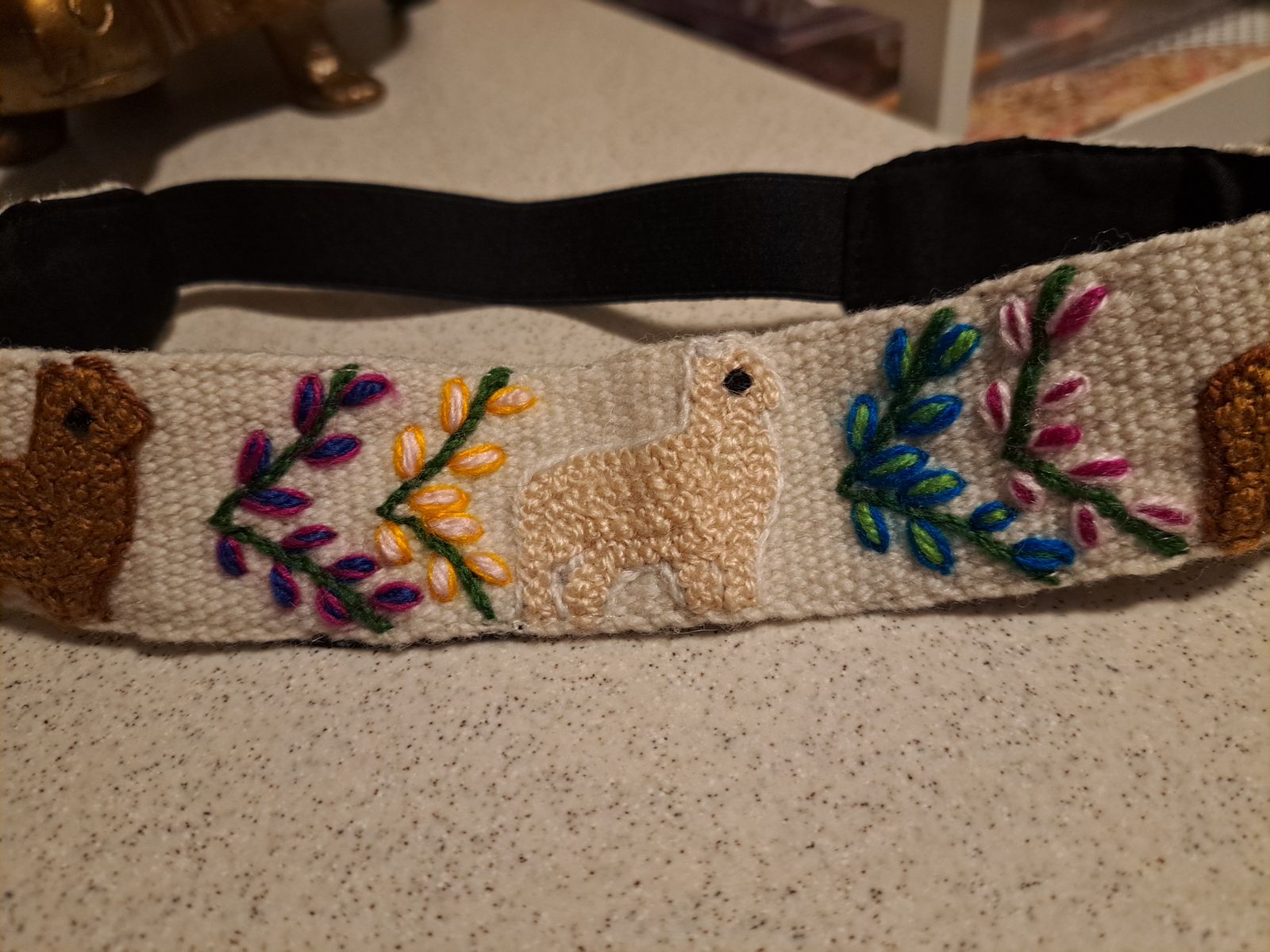 Creating a procession around this alabaster headband, brown llamas and lovely flowers are carefully embroidered by hand. Peruvian artisan Alicia Huaman designs this hair accessory, featuring an elastic band for a comfortable fit.