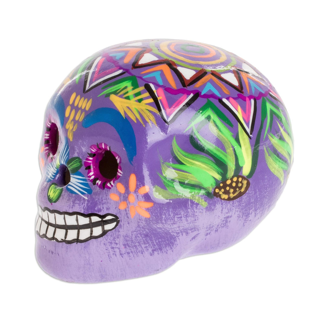 This great figurine is from Vitelio Orozco in Guatemala. The small skull is formed from ceramic and carefully hand-painted with colorful motifs on a lavender background.