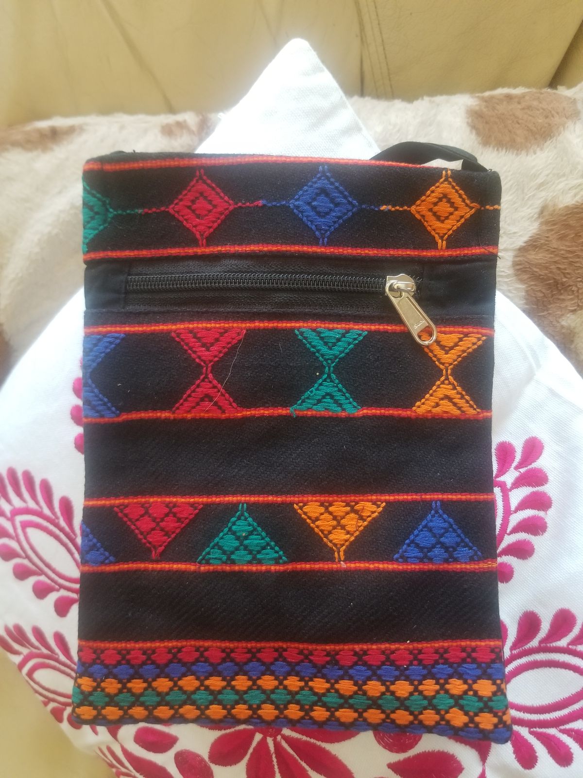 The main weaving technique is called pattu, which is derived from the term patti, meaning "narrow strips." Working on a pit loom, the patterns are woven in two pieces and joined together. The uniqueness of this weaving is the supplemental weft ornamentation, called kashida. This means that extra threads are placed by hand into the horizontal threads to obtain an embroidered effect. The wool's natural colors as well as organic dyes are used to create decor accessories, garments, and wide range of bags and pouches.