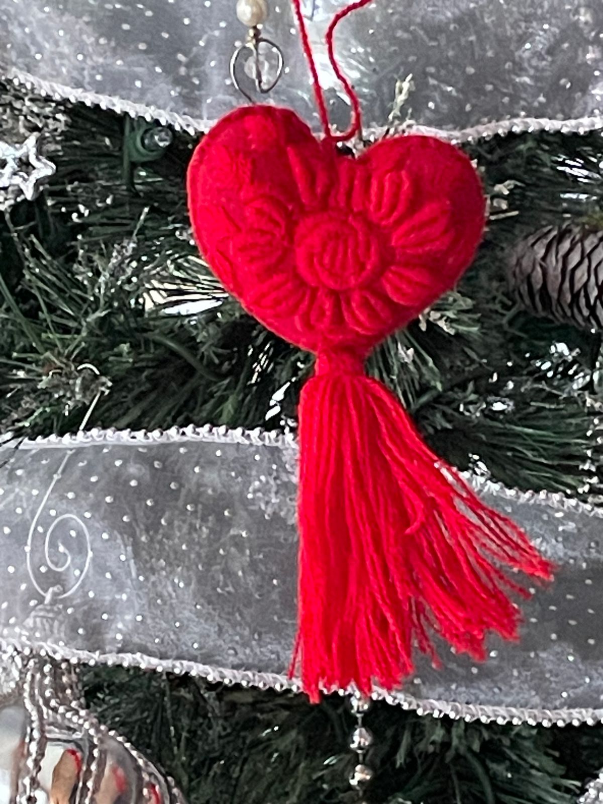 Mexico's Petrona Patishtan brings us a stunning design ideal for adding a lovely touch to your home. This wool felt ornament features a red heart with floral cotton embroidery and a sweet tassel that make a unique creation.