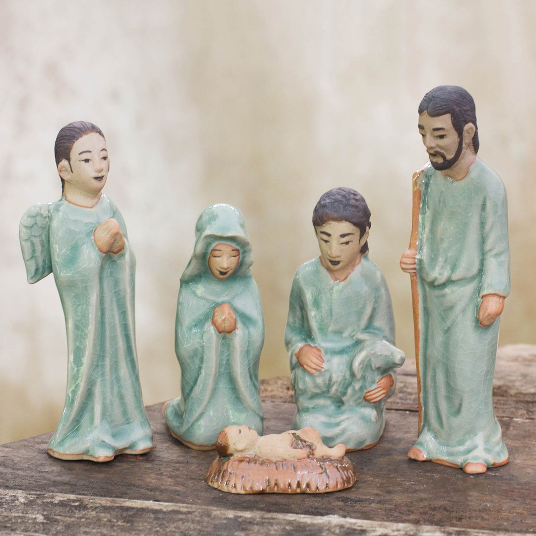 Hand Crafted Celadon Ceramic Nativity Statuettes (set of 5) - Blessed Nativity