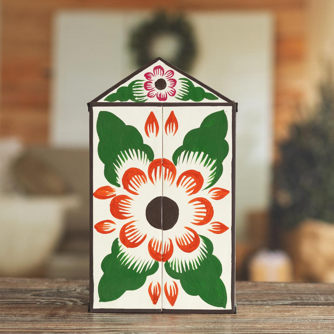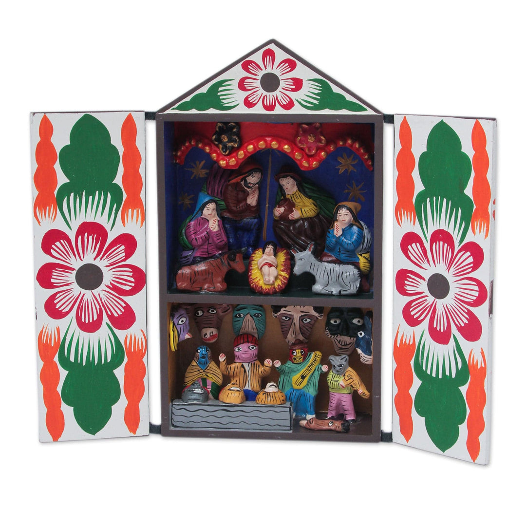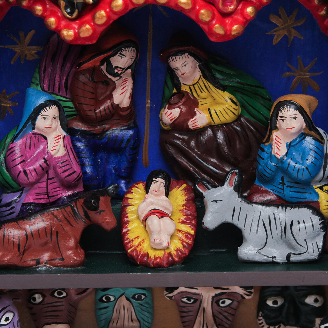 Watching over their tiny son, Mary and Joseph smile as shepherds adore the newborn Christ child. Beneath, musicians in fanciful costumes serenade them. Alejandro Chávez portrays the scenes on two levels in three dimensions. This traditional diorama is known as a retablo; each figurine is modeled and painted by hand.