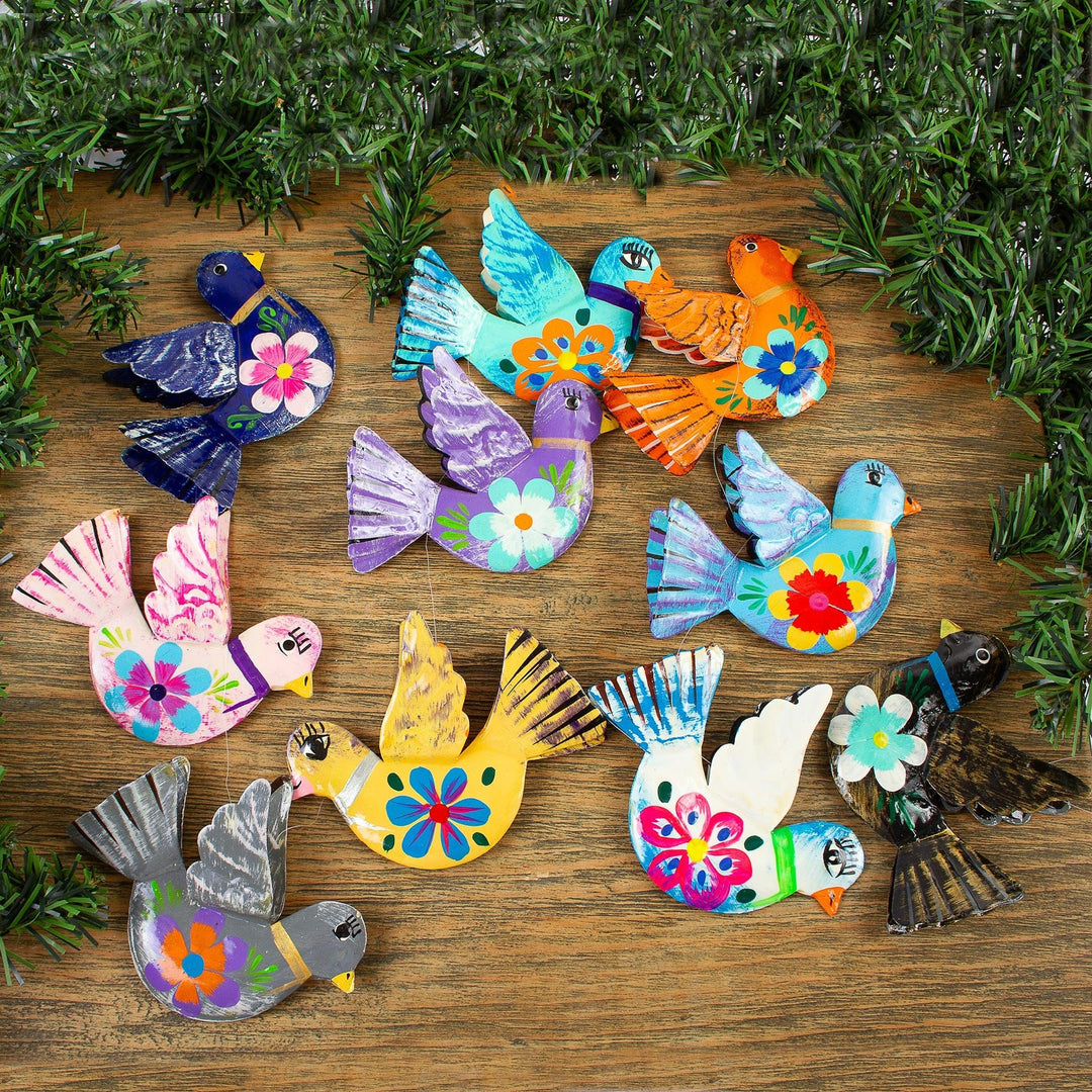 Ten colorful doves flutter along the length of a decorative garland. By Jaime Hernandez, the birds are crafted by hand and painted with floral motifs to bring a festive air to any setting.