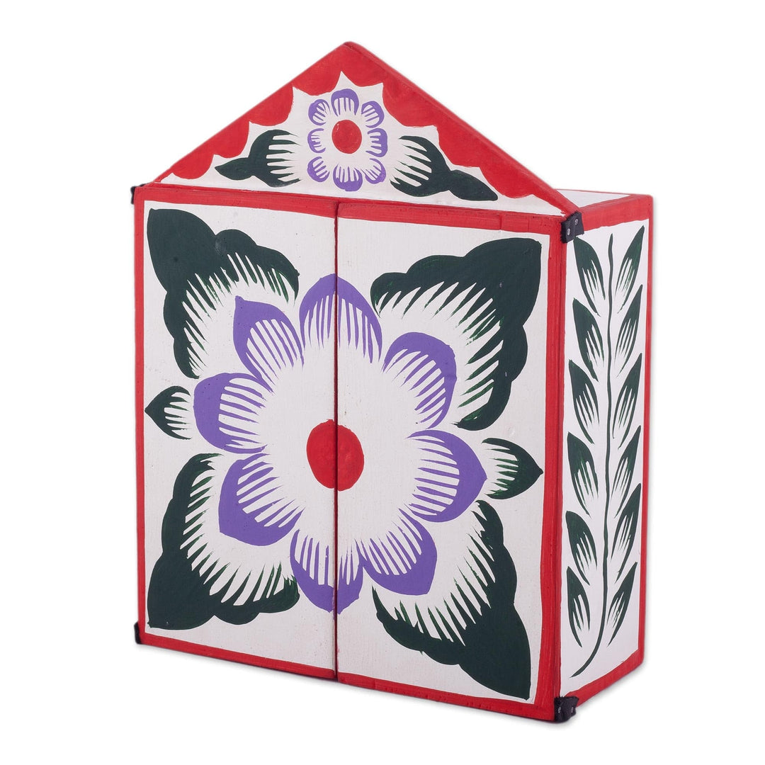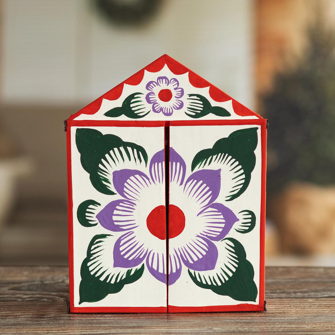 Led to Bethlehem by a star in the east, the Three Kings bring precious gifts to the Christ Child. Mary and Joseph stand on either side as a cow and donkey kneel beside the manger. This colorful box depicts the Epiphany from the Christmas story in the Gospel of Matthew. Alejandro Chávez crafts a traditional Ayacucho-style retablo, a diorama housed in a colorful wood box. The images are modeled of ceramic and painted by hand, and the box closes with a leather latch.