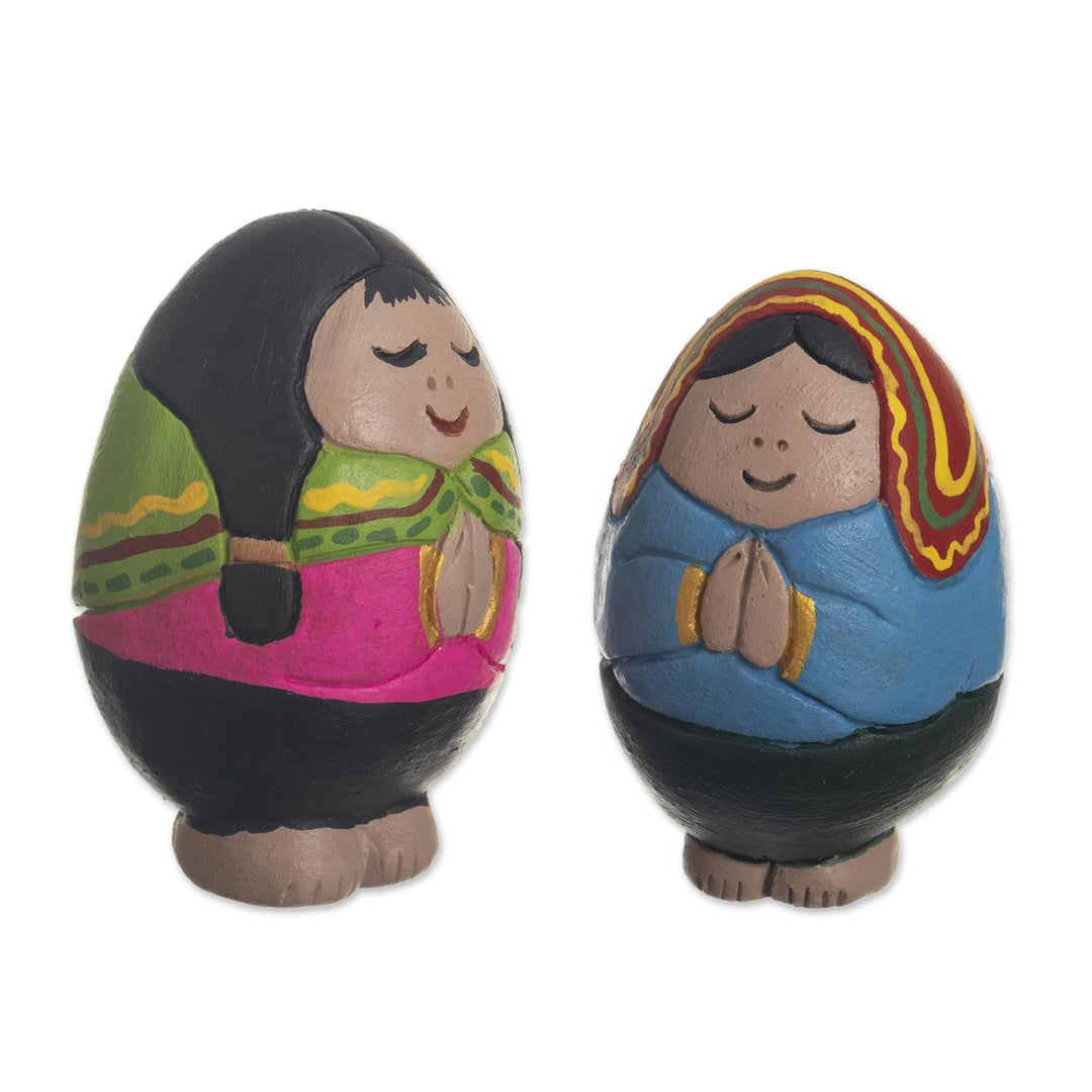 This charming small nativity scene is from Zoila Davila in Peru. Crafted from ceramic in egg-like shapes, the seven pieces are painted by hand in colorful detail. Clad in traditional Andean clothing, Mary, Joseph and baby Jesus are accompanied by a golden-winged angel and three farm animals.